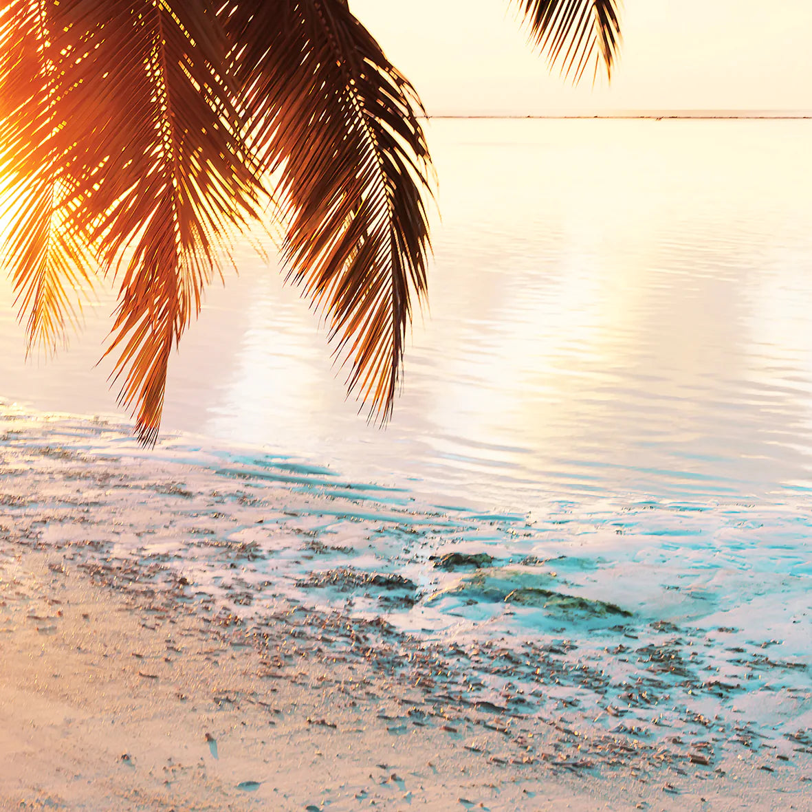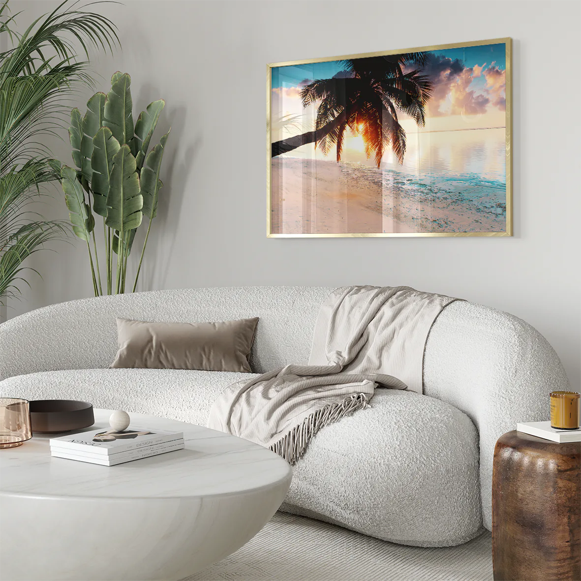 静寂なビーチに佇むヤシの木と、オレンジに染まる夕日が織りなすハワイアンサンセットのアートポスター。波音が聞こえてきそうな穏やかな海景色と温かな光のグラデーションが、空間にトロピカルな安らぎをもたらします。リビング・寝室・書斎など、日常に癒しの時間を求める方におすすめ。リゾート気分を味わえる、心安らぐ風景画です。