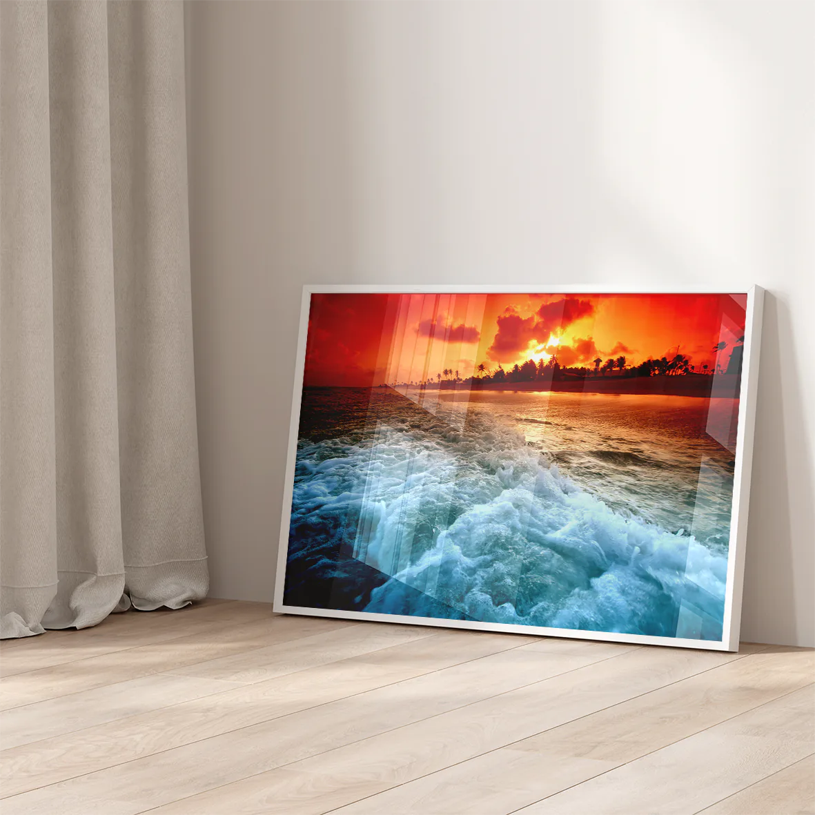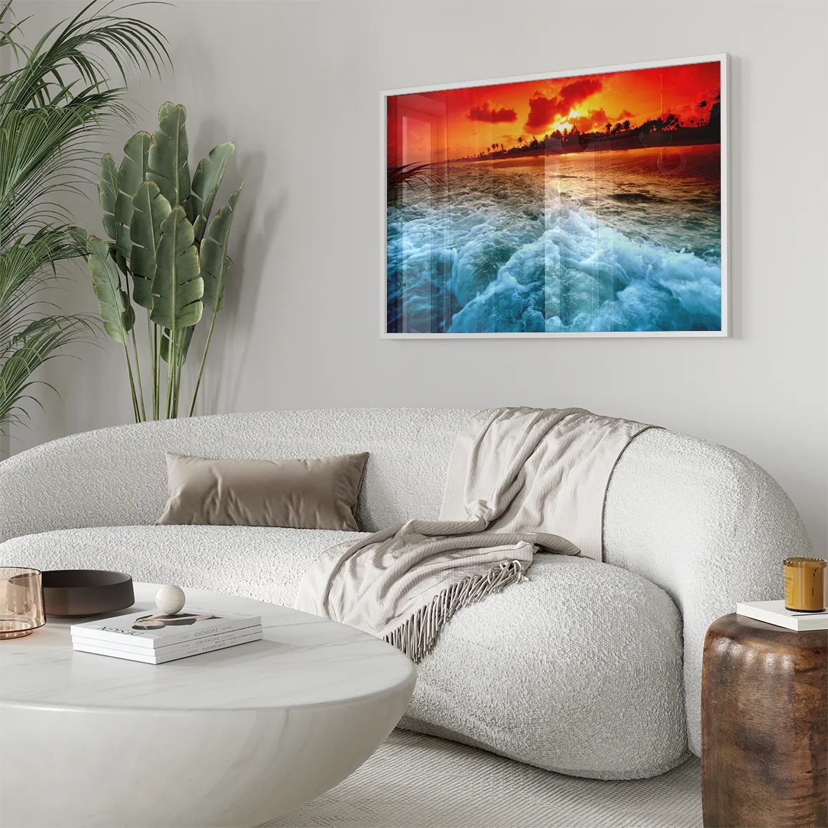 空を真紅に染める夕陽が海面に映り込み、白い飛沫が煌めく波とパームツリーの影がシルエットを描く一枚。南国リゾートの開放感とドラマティックな色彩が、空間に活力と非日常の癒やしをもたらします。リビングや玄関、オフィスまで幅広く調和する北欧モダンテイストのアートポスターで、日常にサンセットの余韻を添えてください。