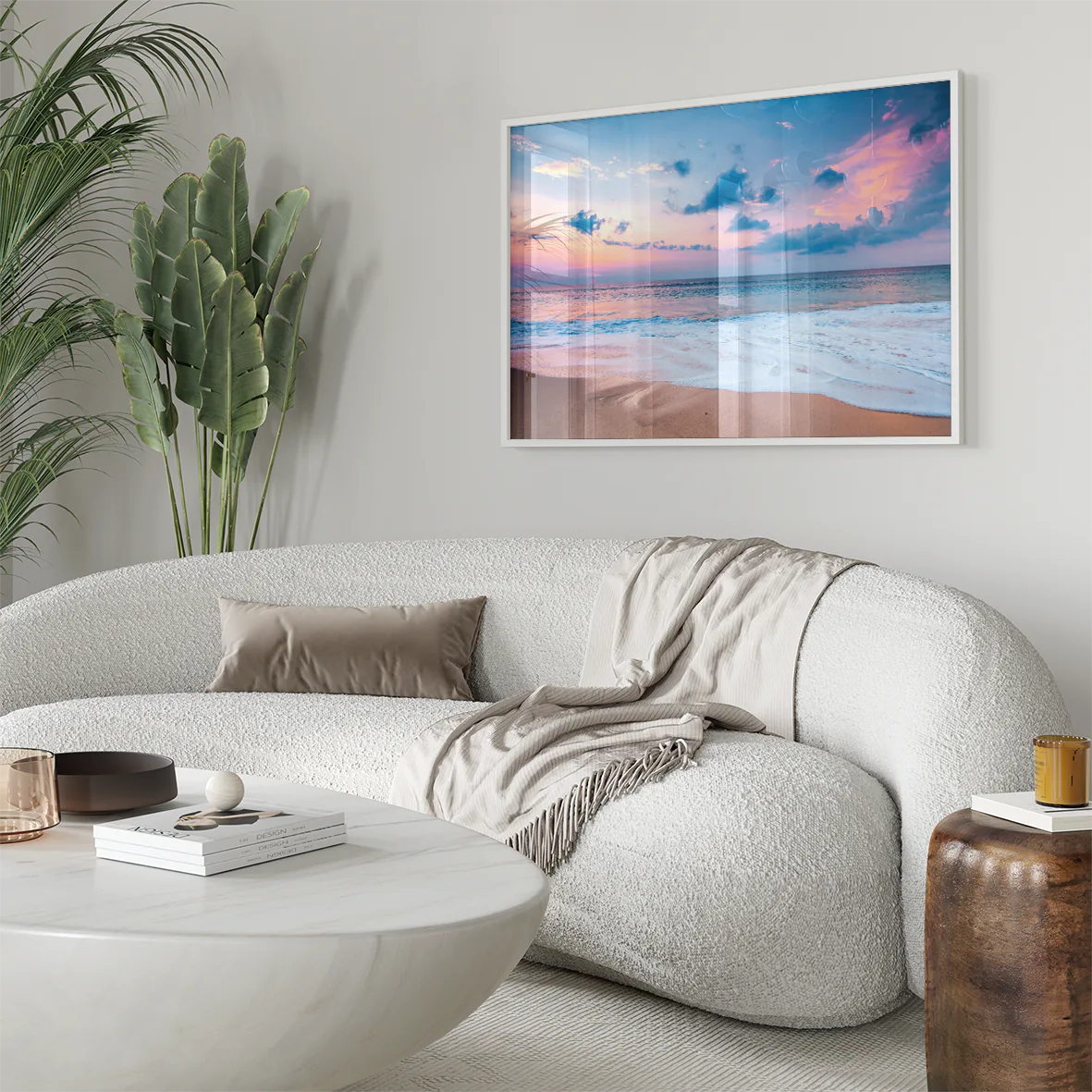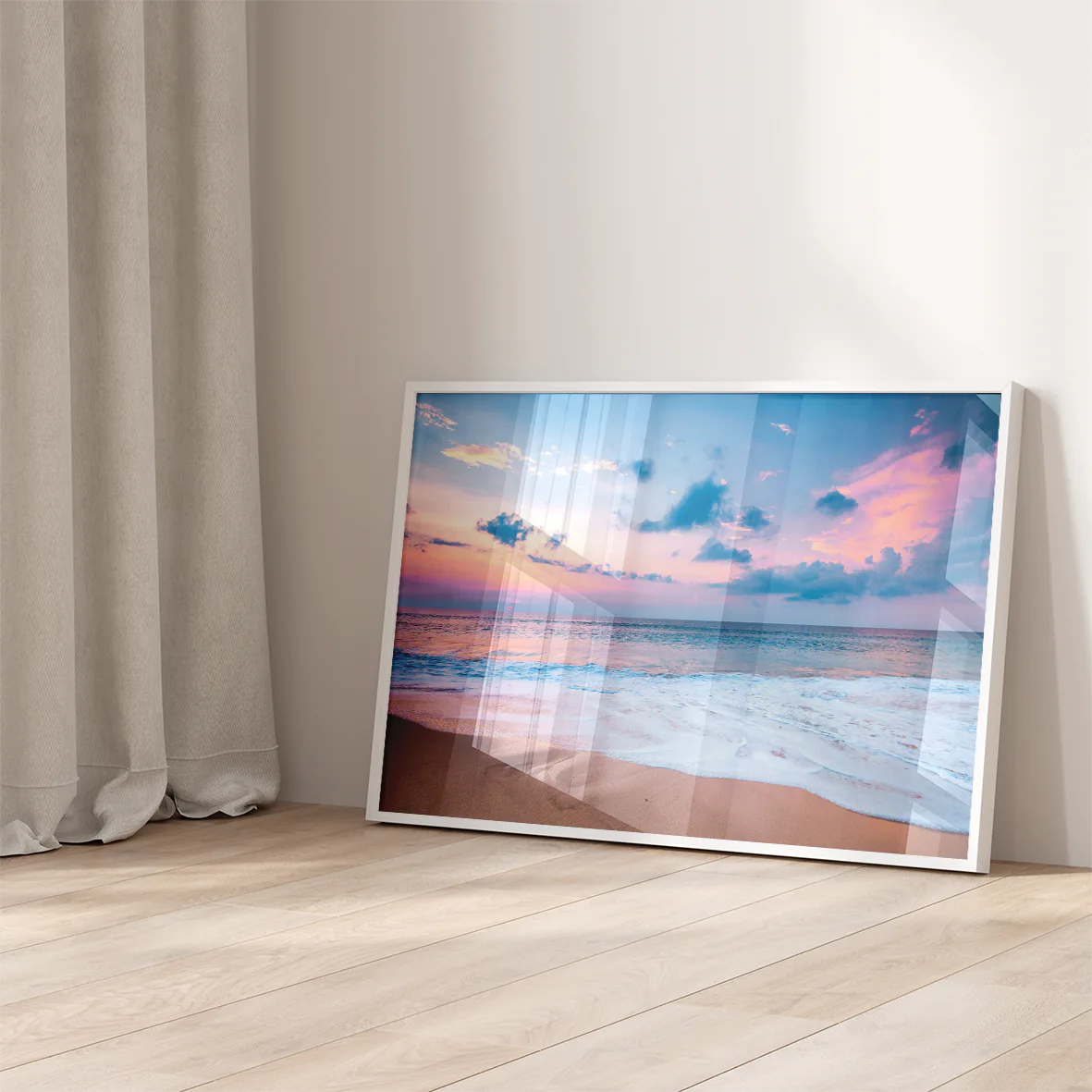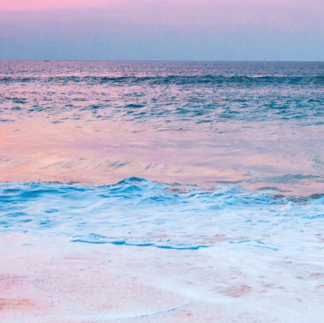 ピンクとオレンジのグラデーションが海面を染め、穏やかな波が夕陽を映し出す瞬間を切り取った一枚。柔らかな光と透明感のあるブルーが空間に開放感をもたらし、リビングや玄関、オフィスにも爽やかなリゾートムードを演出します。北欧テイストやシンプルモダンのインテリアに溶け込み、日常にサンセットの癒やしを届けるアートポスターです。