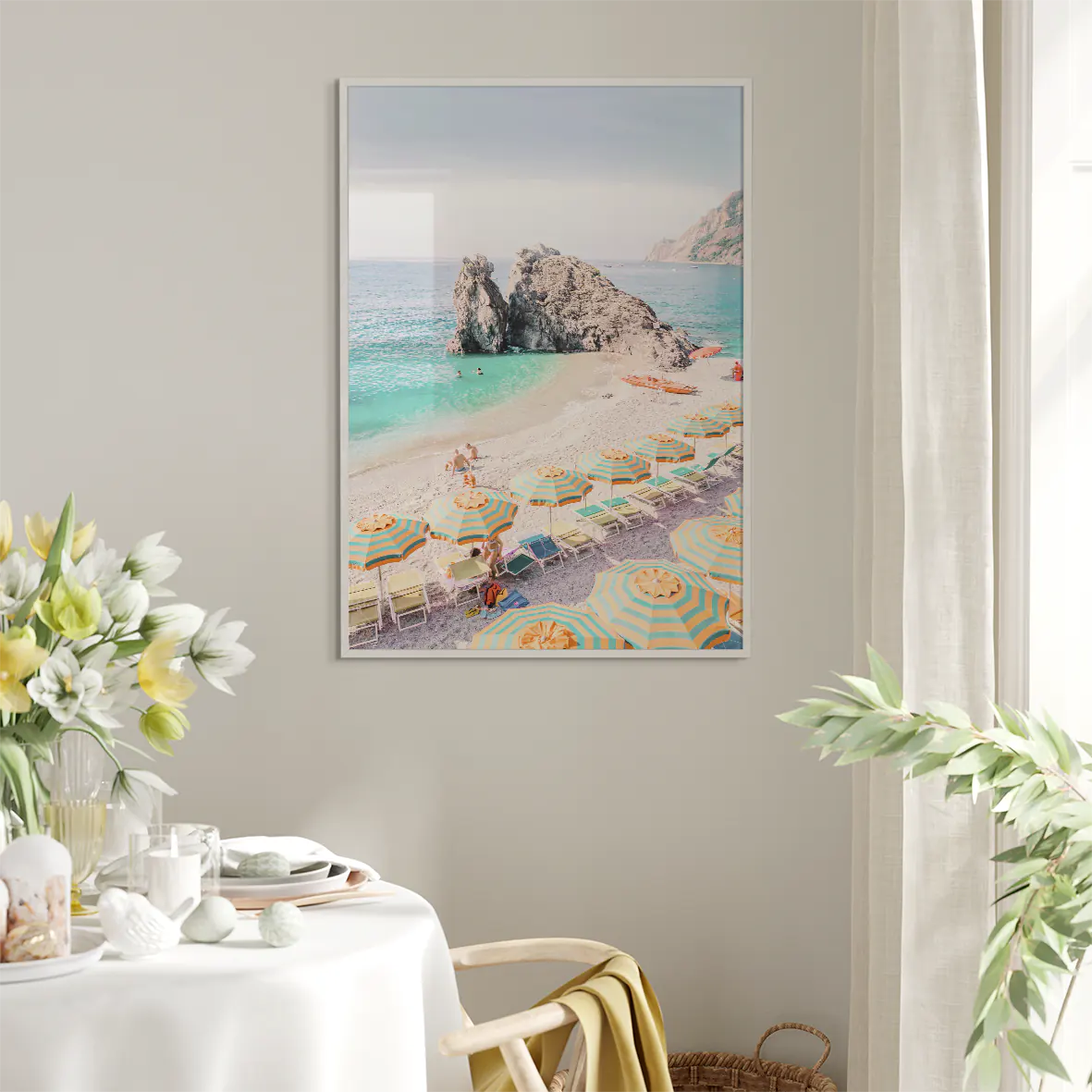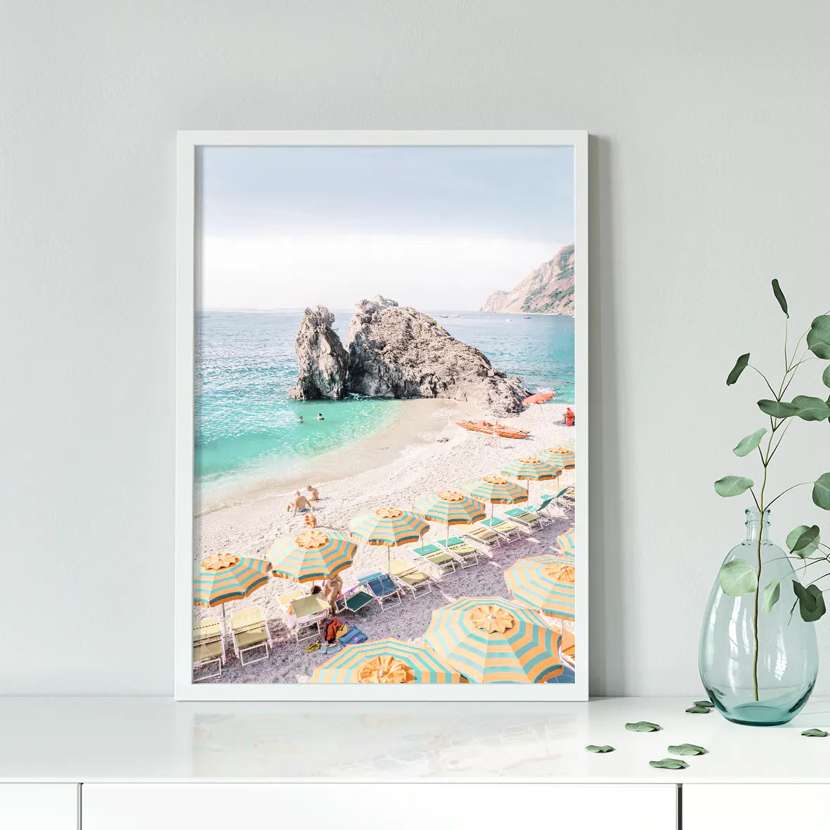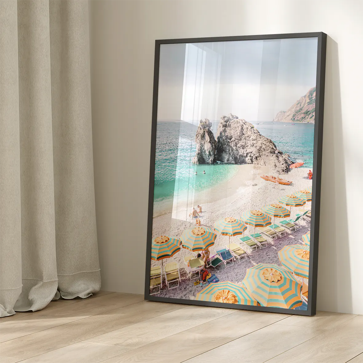 まばゆい地中海の陽光を受けて輝くターコイズブルーの波と、黄色×グリーンのストライプパラソルが生み出す軽やかなリズム。モンテロッソ・アル・マーレの象徴的な岩礁と白砂のコントラストが、空間にバカンスのような開放感をもたらします。爽やかな色彩がリビングや玄関、オフィスにリゾートの風を運び、北欧テイストやシンプルモダンのインテリアとも美しく調和する一枚です。