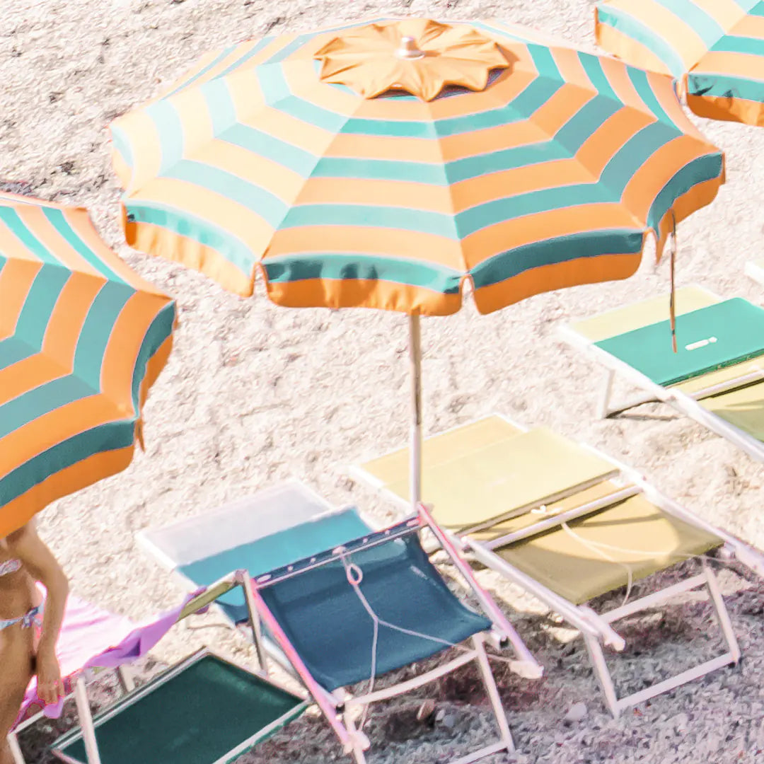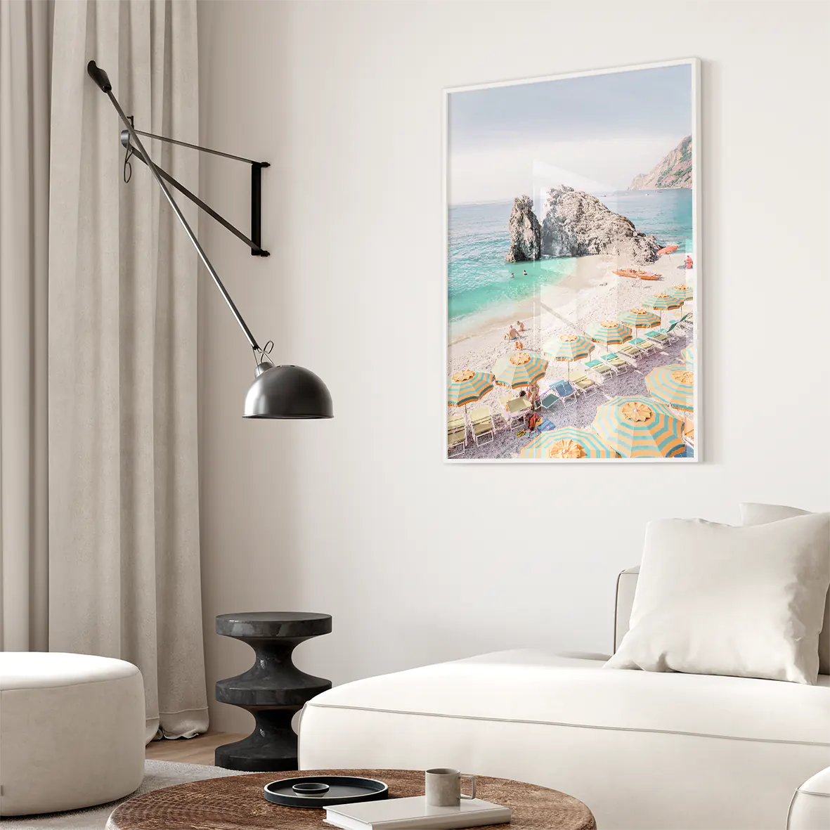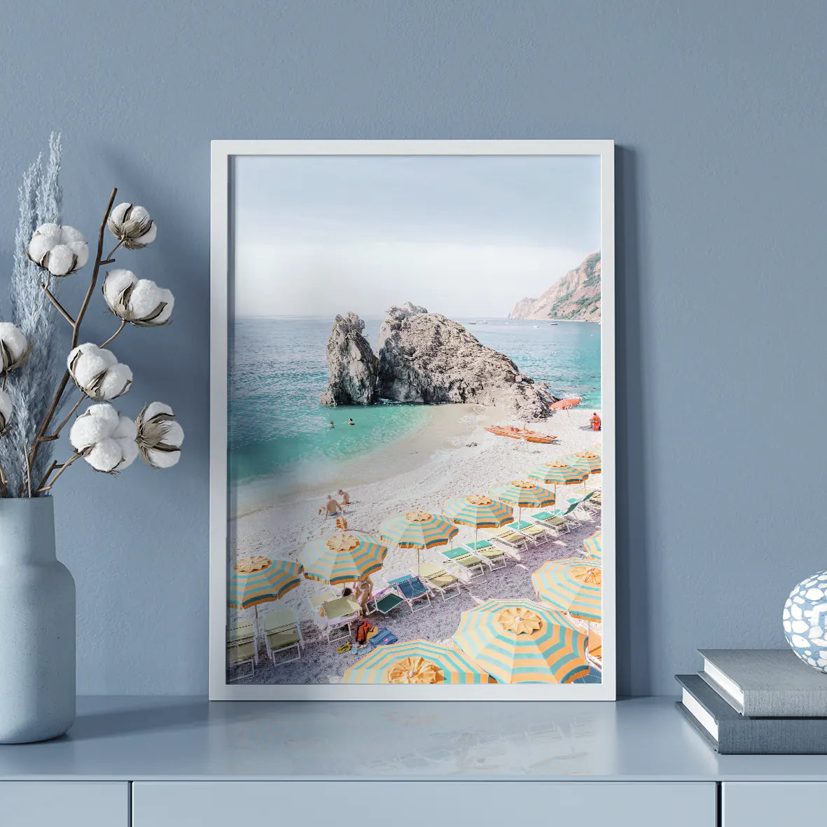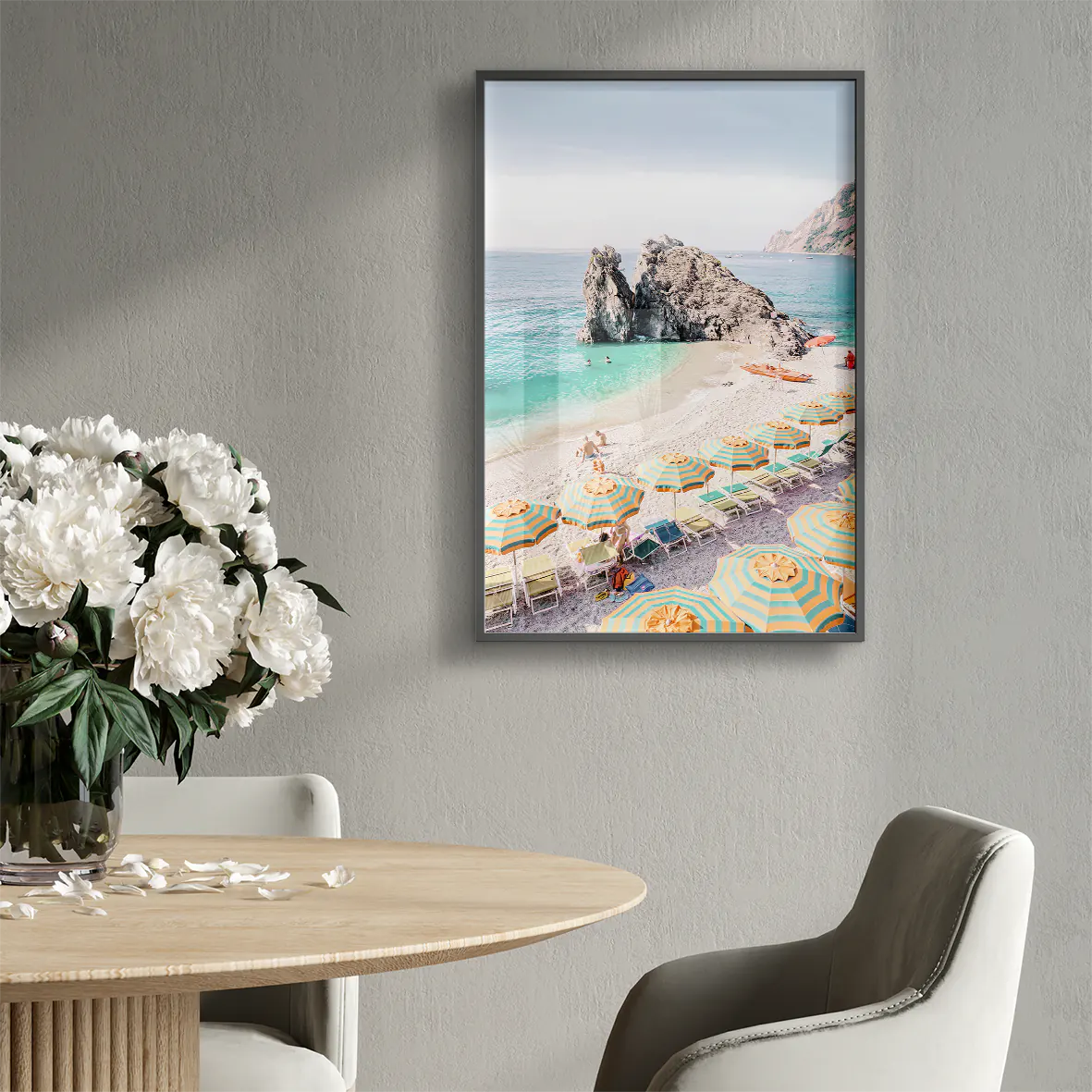 まばゆい地中海の陽光を受けて輝くターコイズブルーの波と、黄色×グリーンのストライプパラソルが生み出す軽やかなリズム。モンテロッソ・アル・マーレの象徴的な岩礁と白砂のコントラストが、空間にバカンスのような開放感をもたらします。爽やかな色彩がリビングや玄関、オフィスにリゾートの風を運び、北欧テイストやシンプルモダンのインテリアとも美しく調和する一枚です。