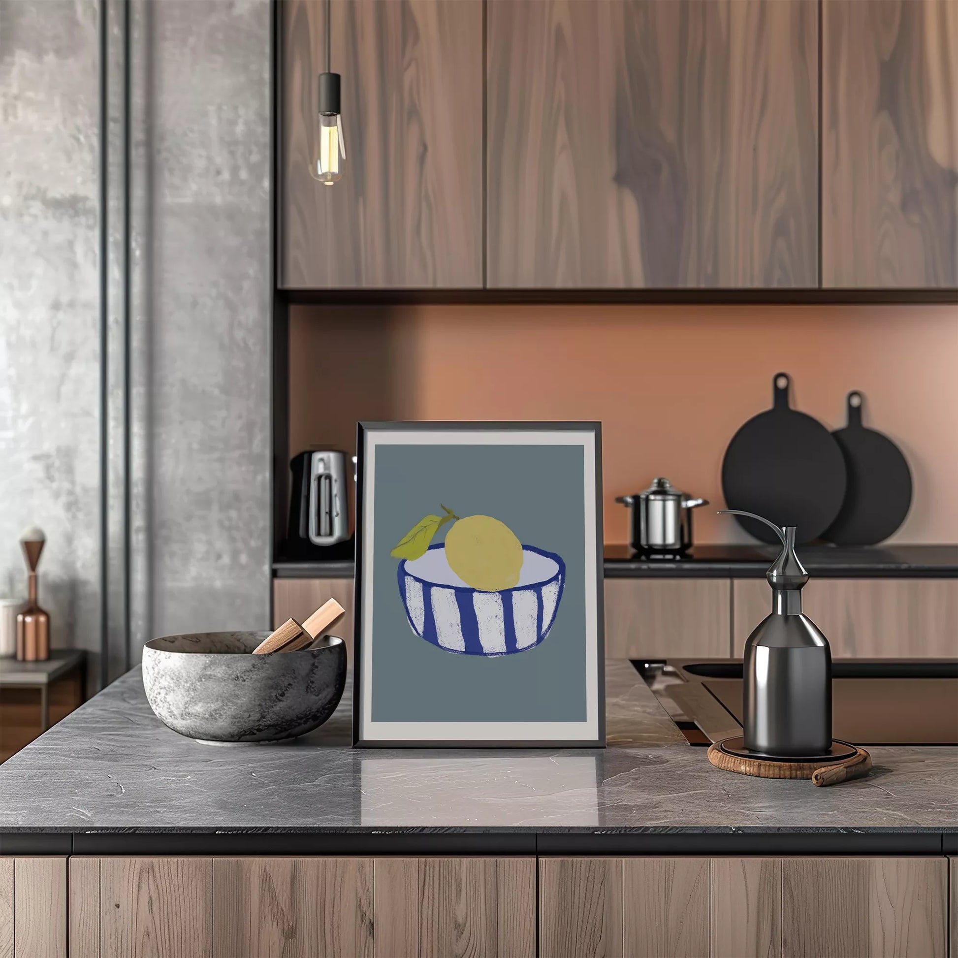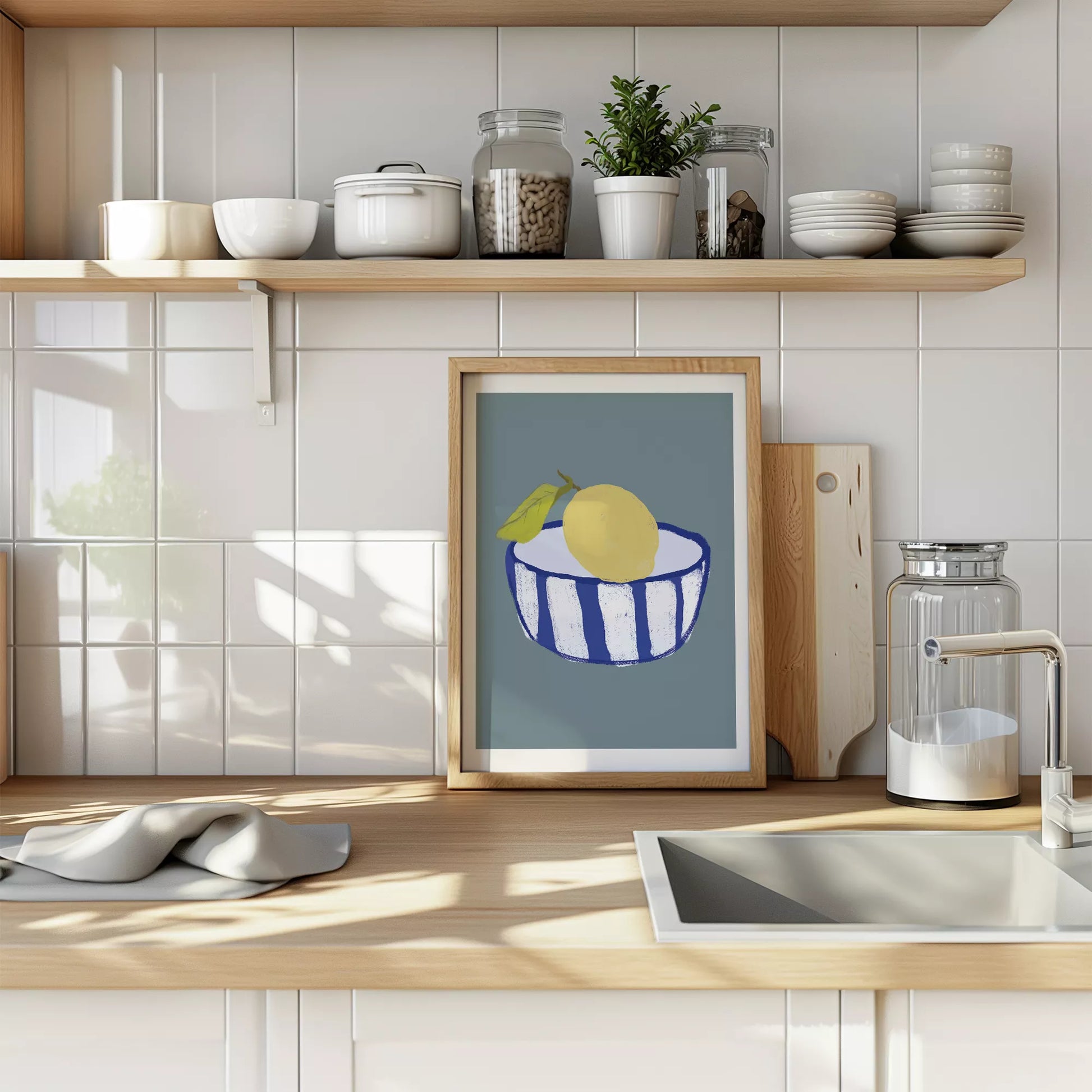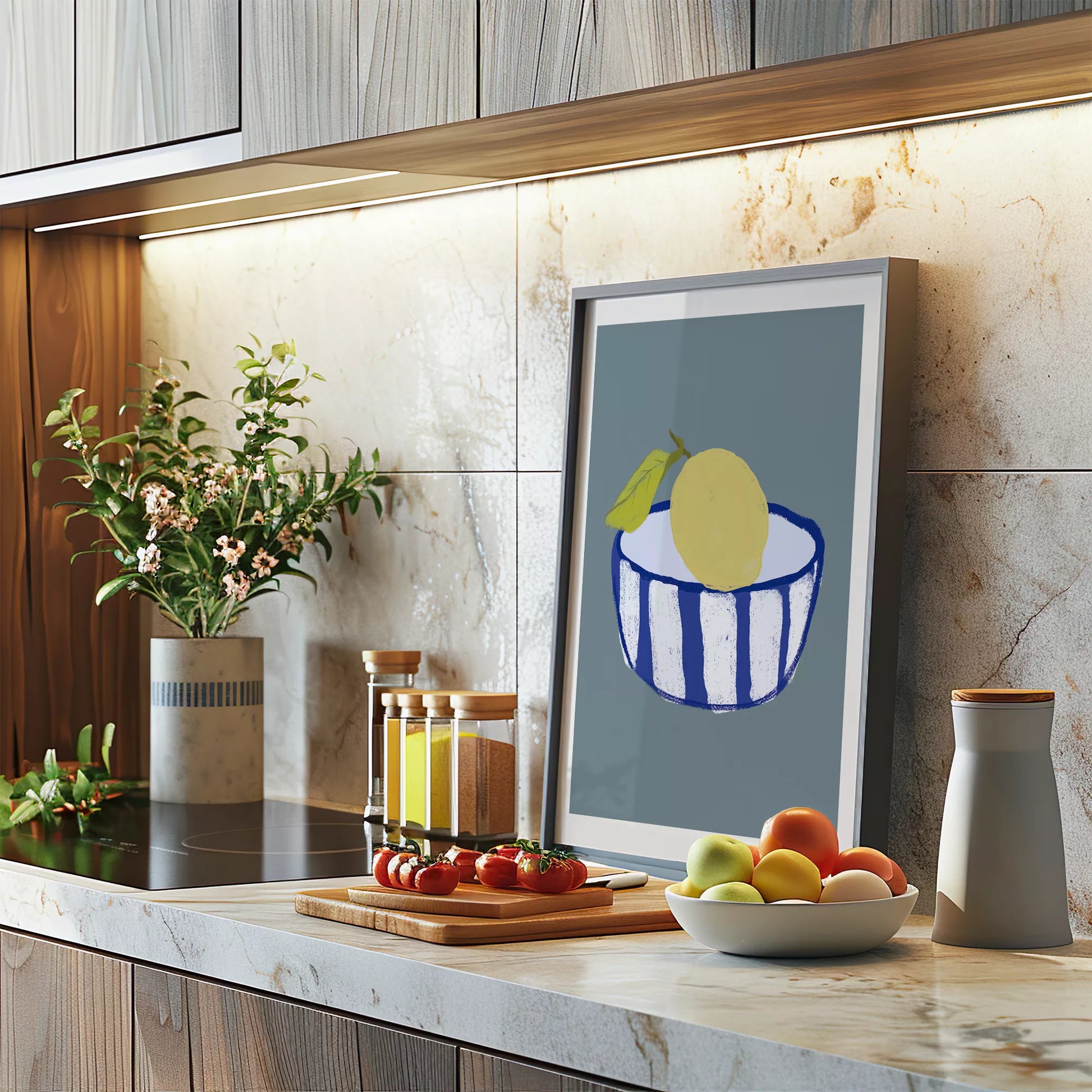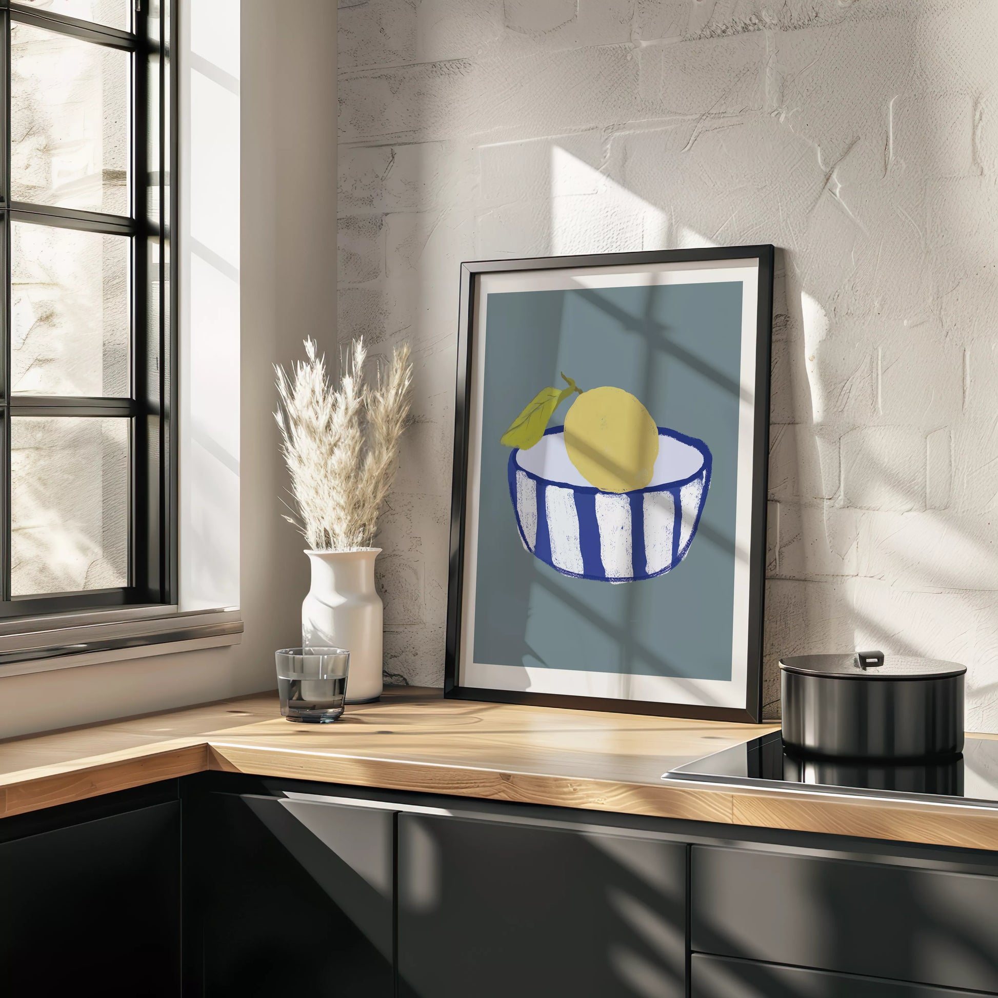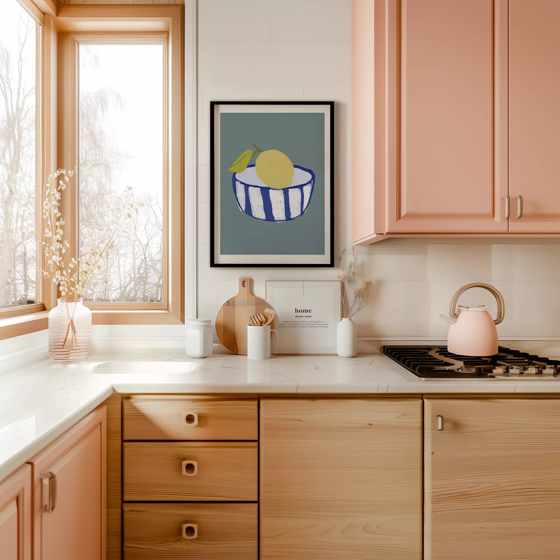 爽やかなレモンイエローとクールなブルーのストライプが印象的なミニマルボウルのキッチンアート。シンプルながらも洗練されたデザインが、キッチンやダイニング空間に清潔感と明るさをもたらします。北欧モダンキッチンやカフェ風インテリアとの相性は抜群で、料理の時間をより楽しく彩ります。