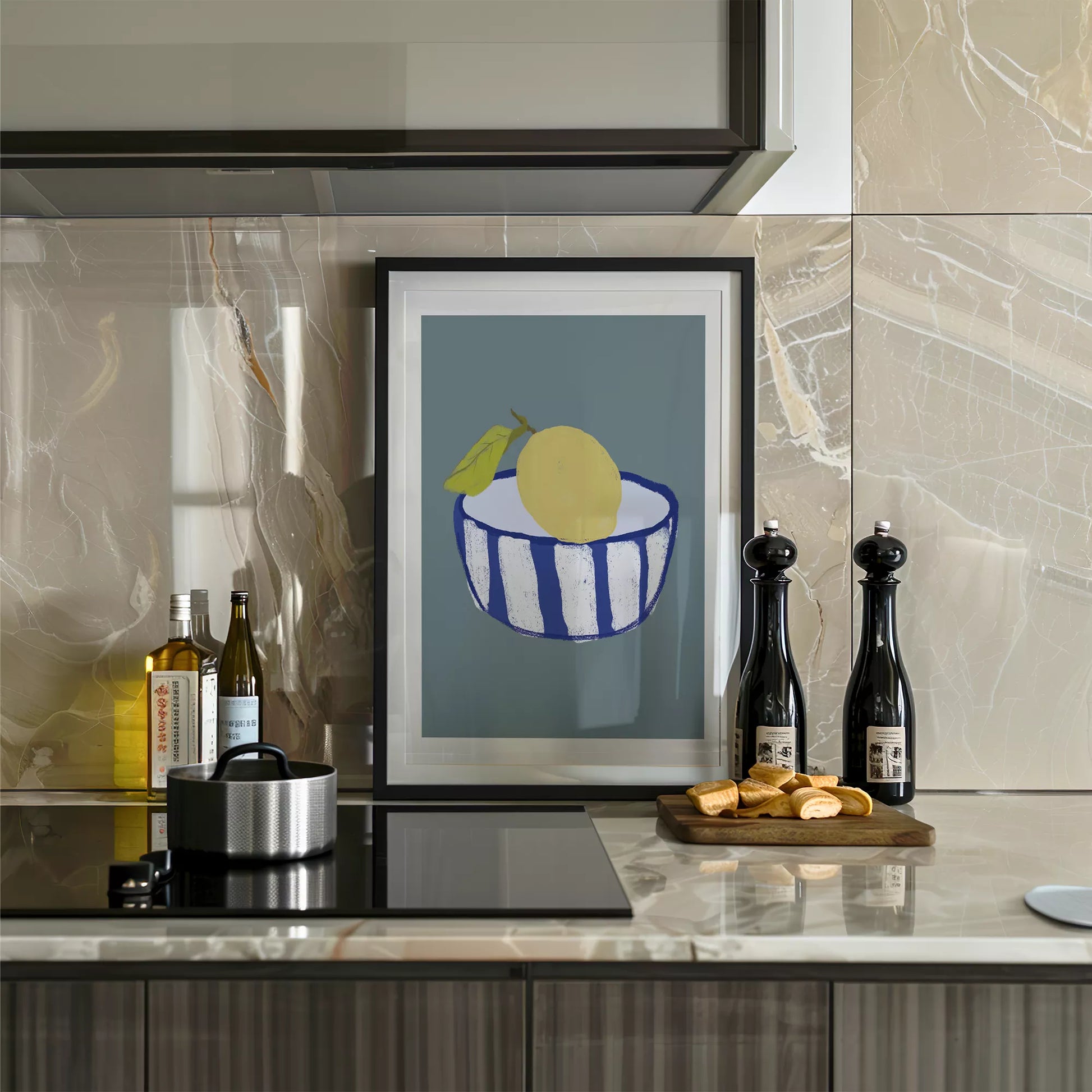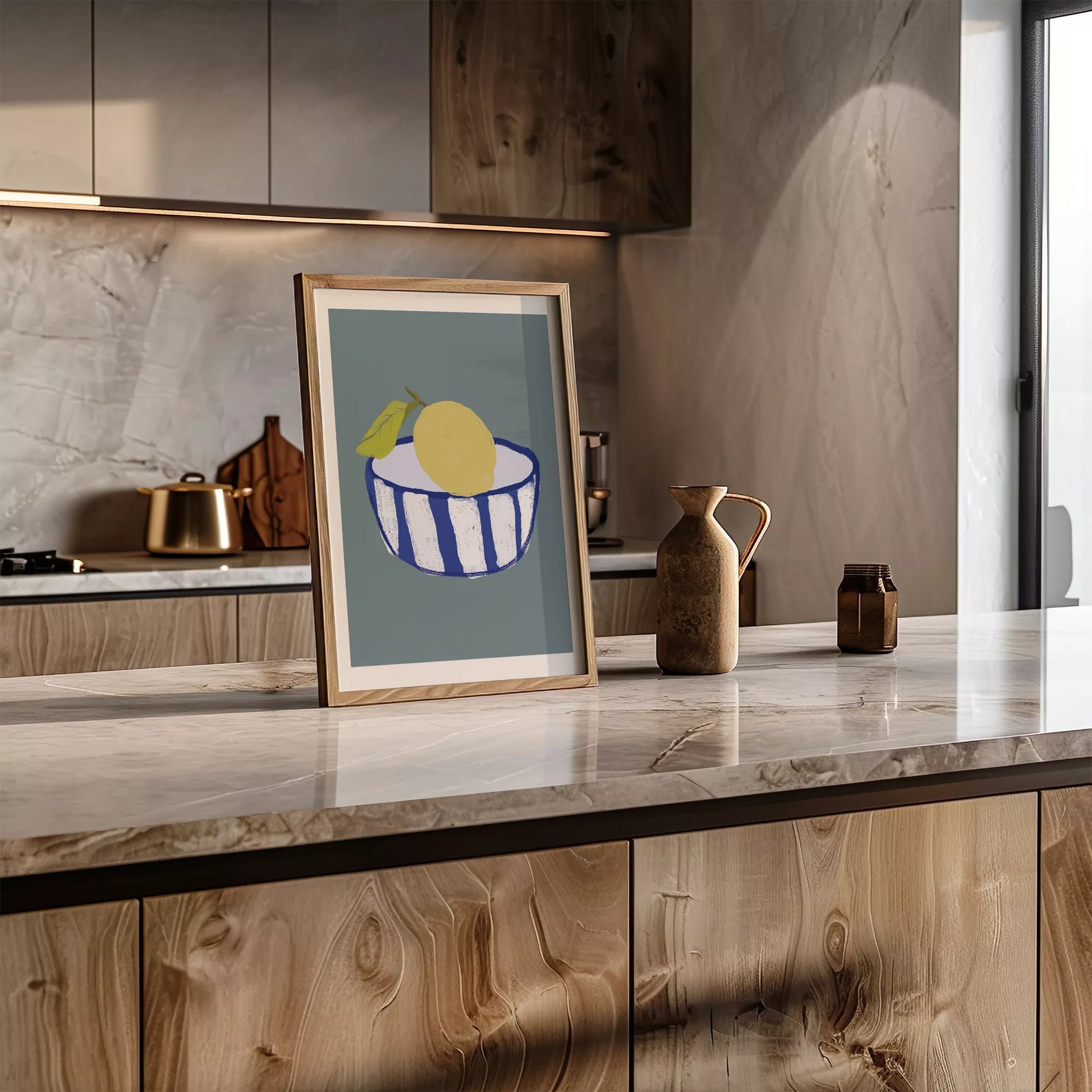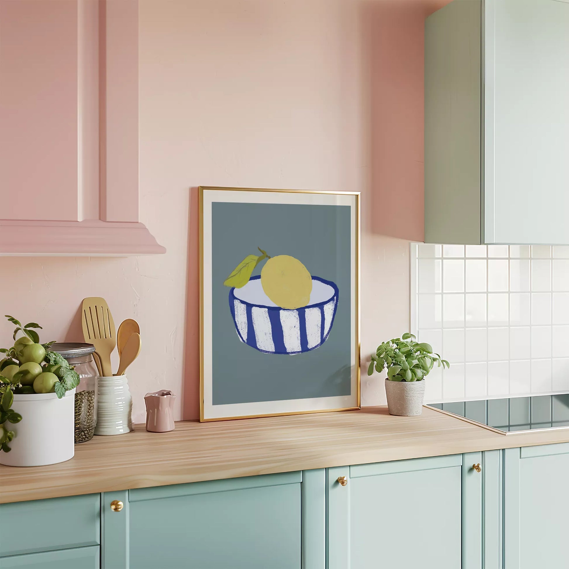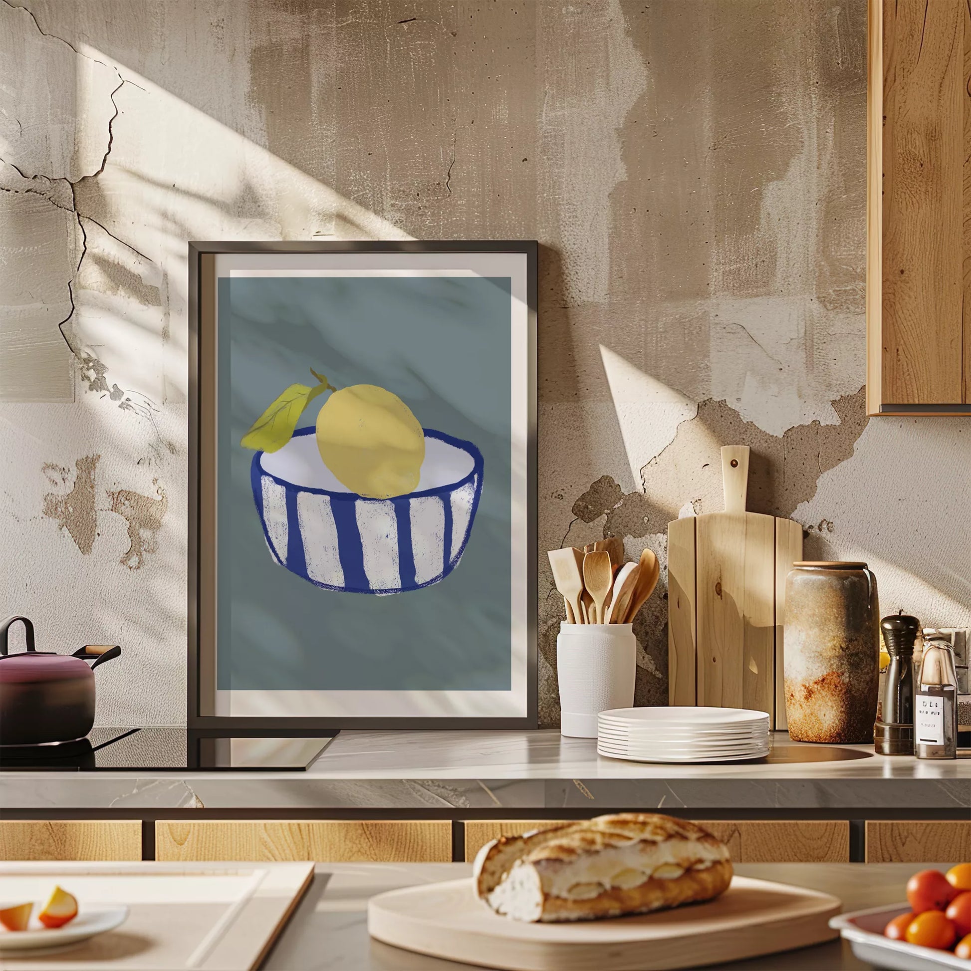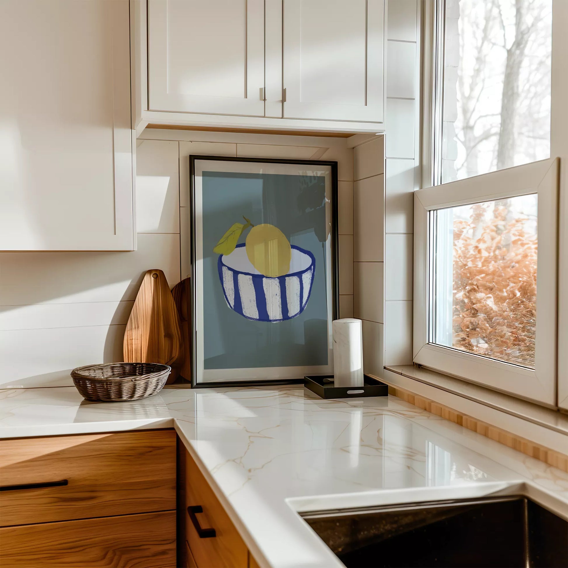 爽やかなレモンイエローとクールなブルーのストライプが印象的なミニマルボウルのキッチンアート。シンプルながらも洗練されたデザインが、キッチンやダイニング空間に清潔感と明るさをもたらします。北欧モダンキッチンやカフェ風インテリアとの相性は抜群で、料理の時間をより楽しく彩ります。