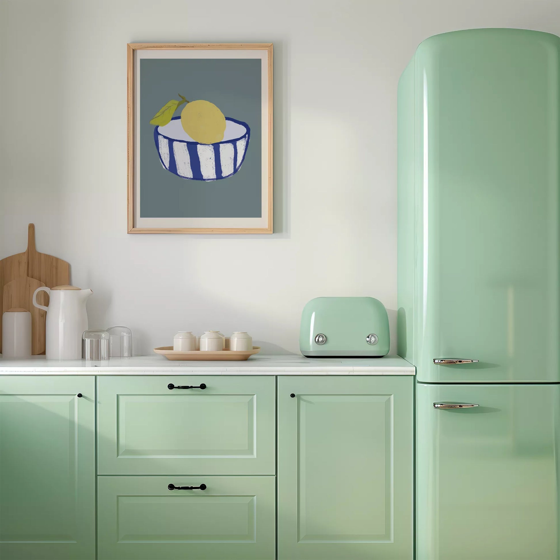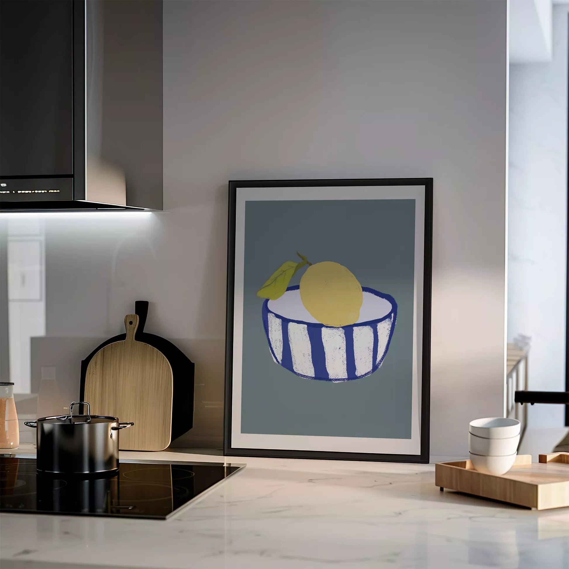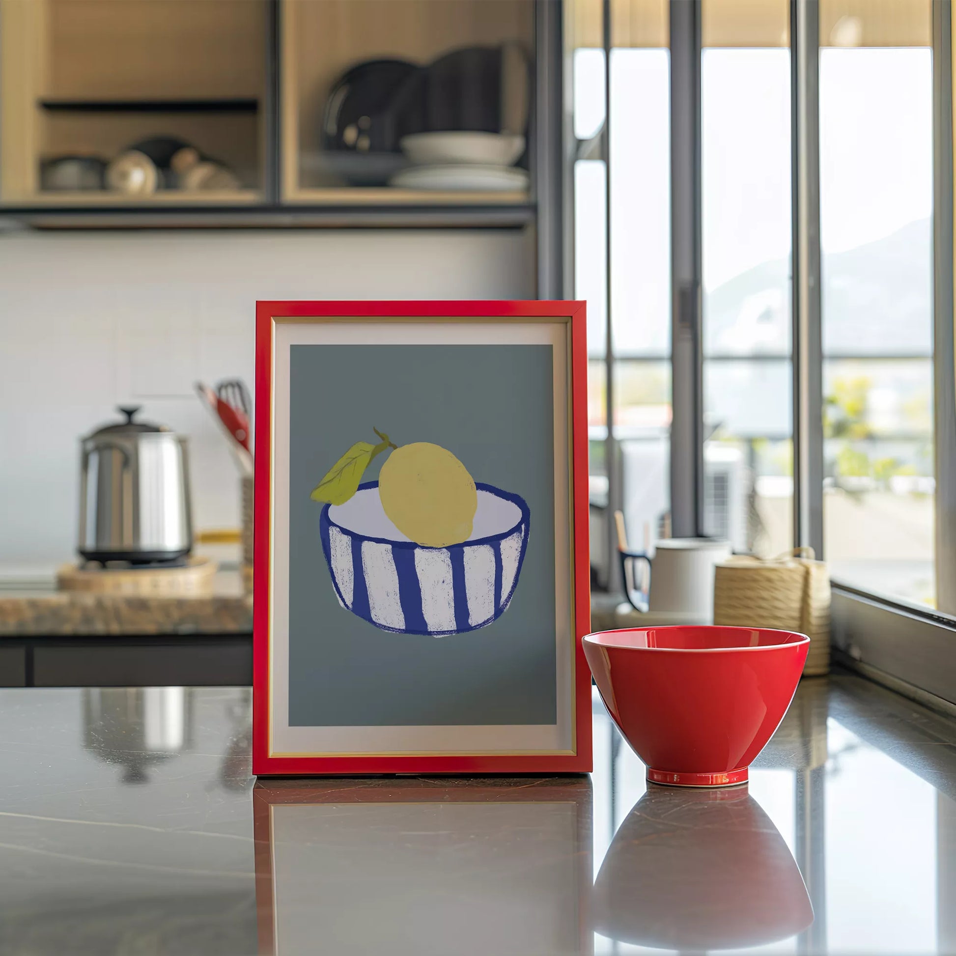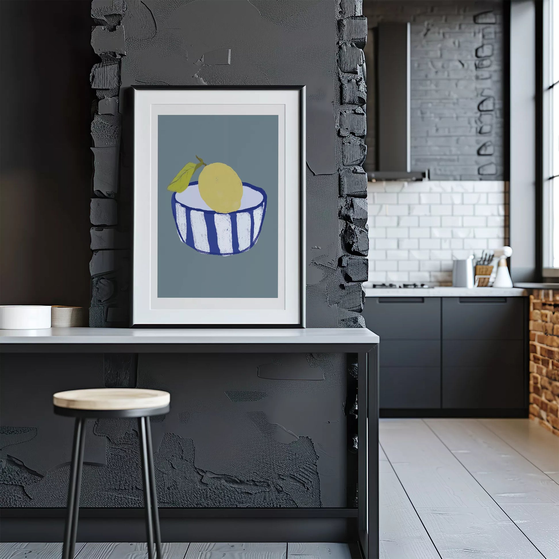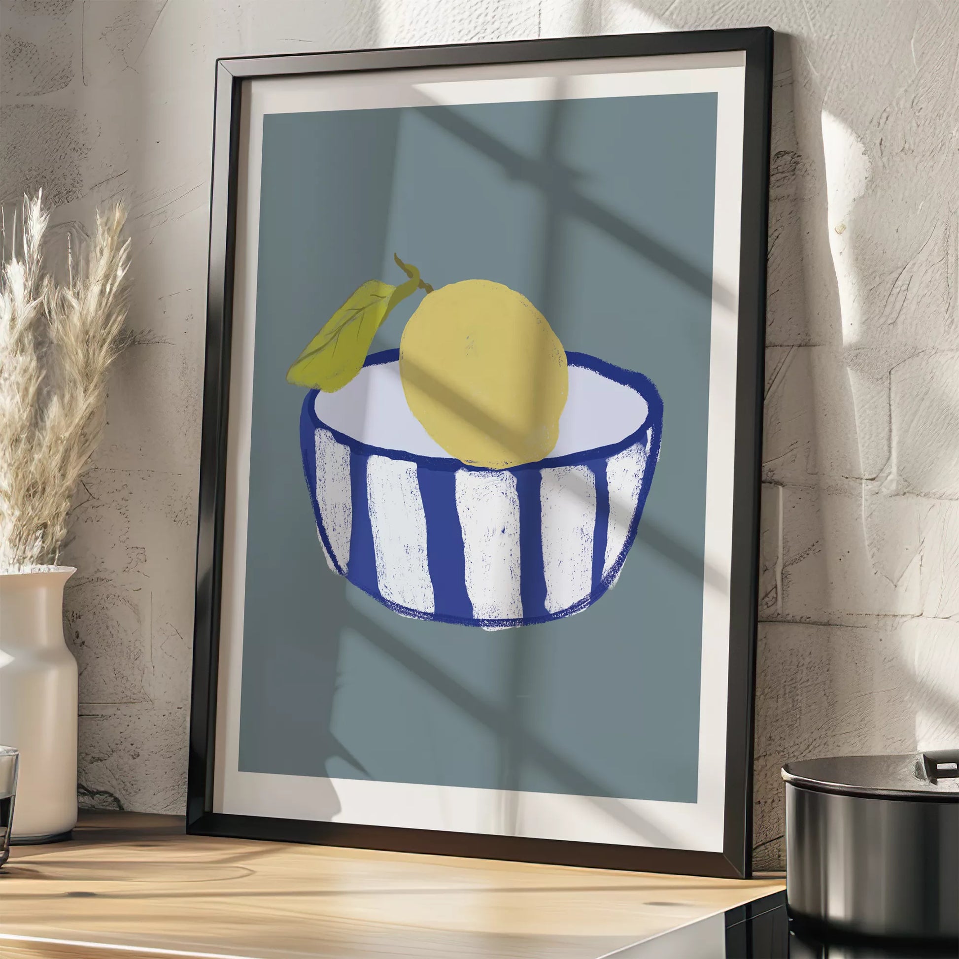 爽やかなレモンイエローとクールなブルーのストライプが印象的なミニマルボウルのキッチンアート。シンプルながらも洗練されたデザインが、キッチンやダイニング空間に清潔感と明るさをもたらします。北欧モダンキッチンやカフェ風インテリアとの相性は抜群で、料理の時間をより楽しく彩ります。