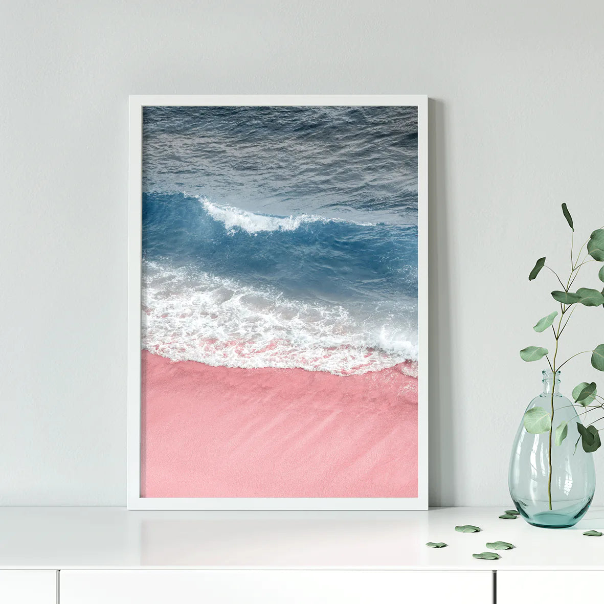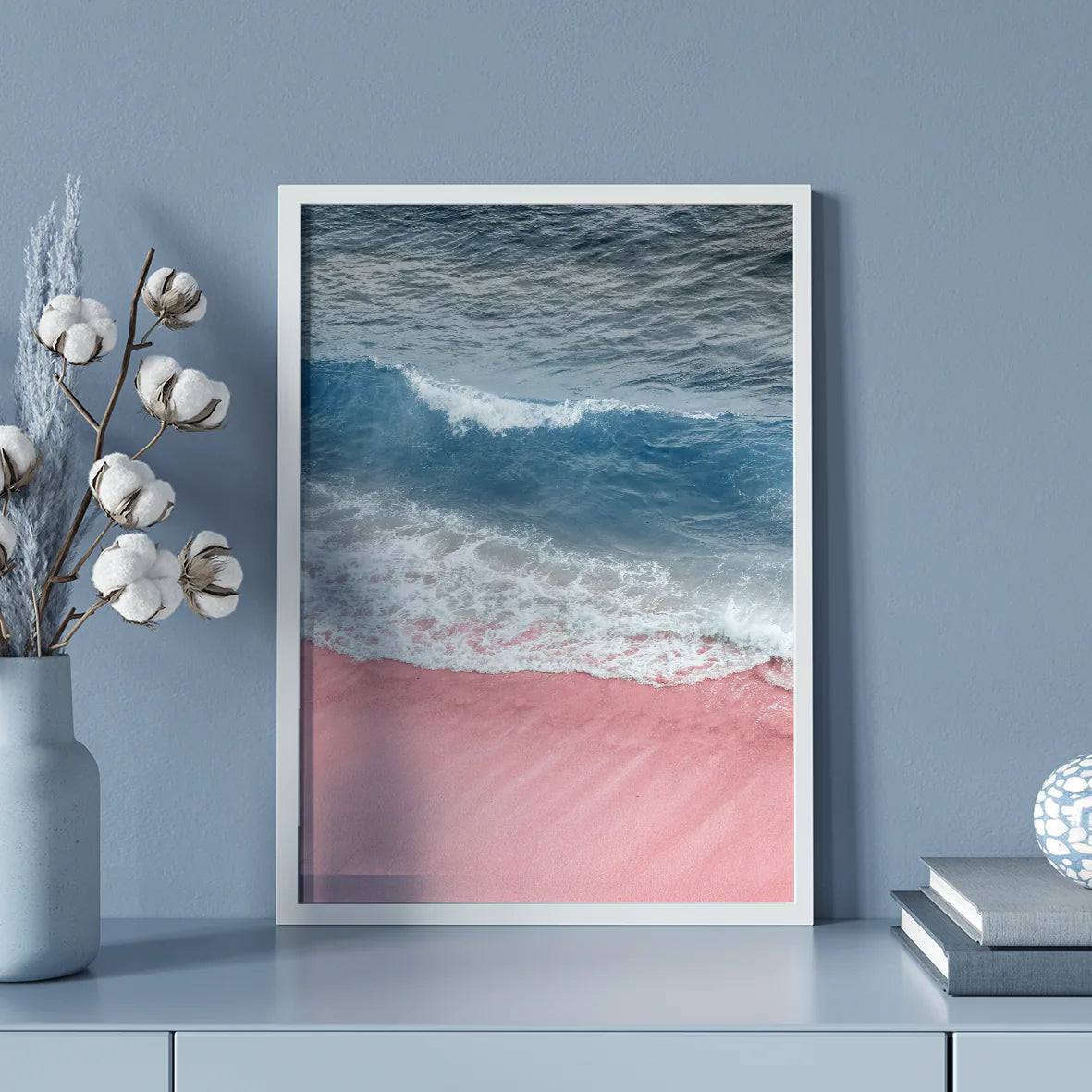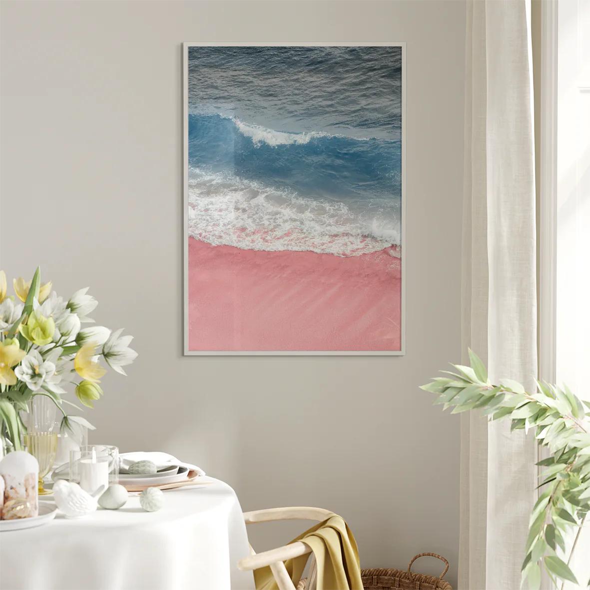 夢のような柔らかなピンクの砂浜と、穏やかに寄せる波を捉えたパステル調のビーチアートポスター。優しい色合いとミニマルな構図が、空間に北欧風の静寂と癒しをもたらします。リビング・寝室・書斎など様々なシーンで、日常に安らぎのひとときを演出。ストレス社会に疲れた心を優しく包む、タイムレスな海景色です。