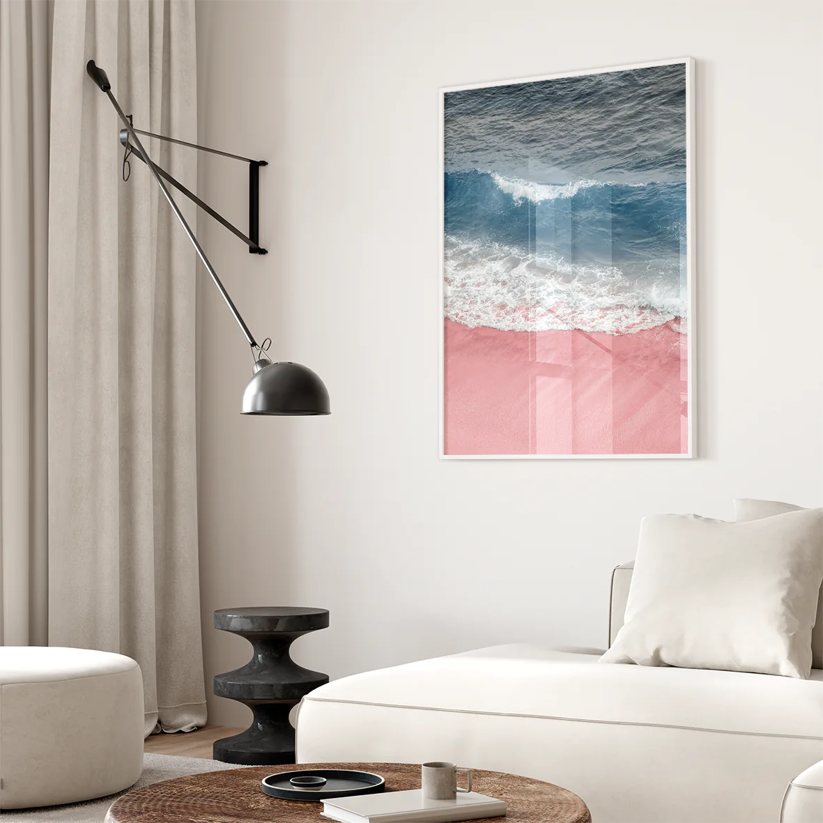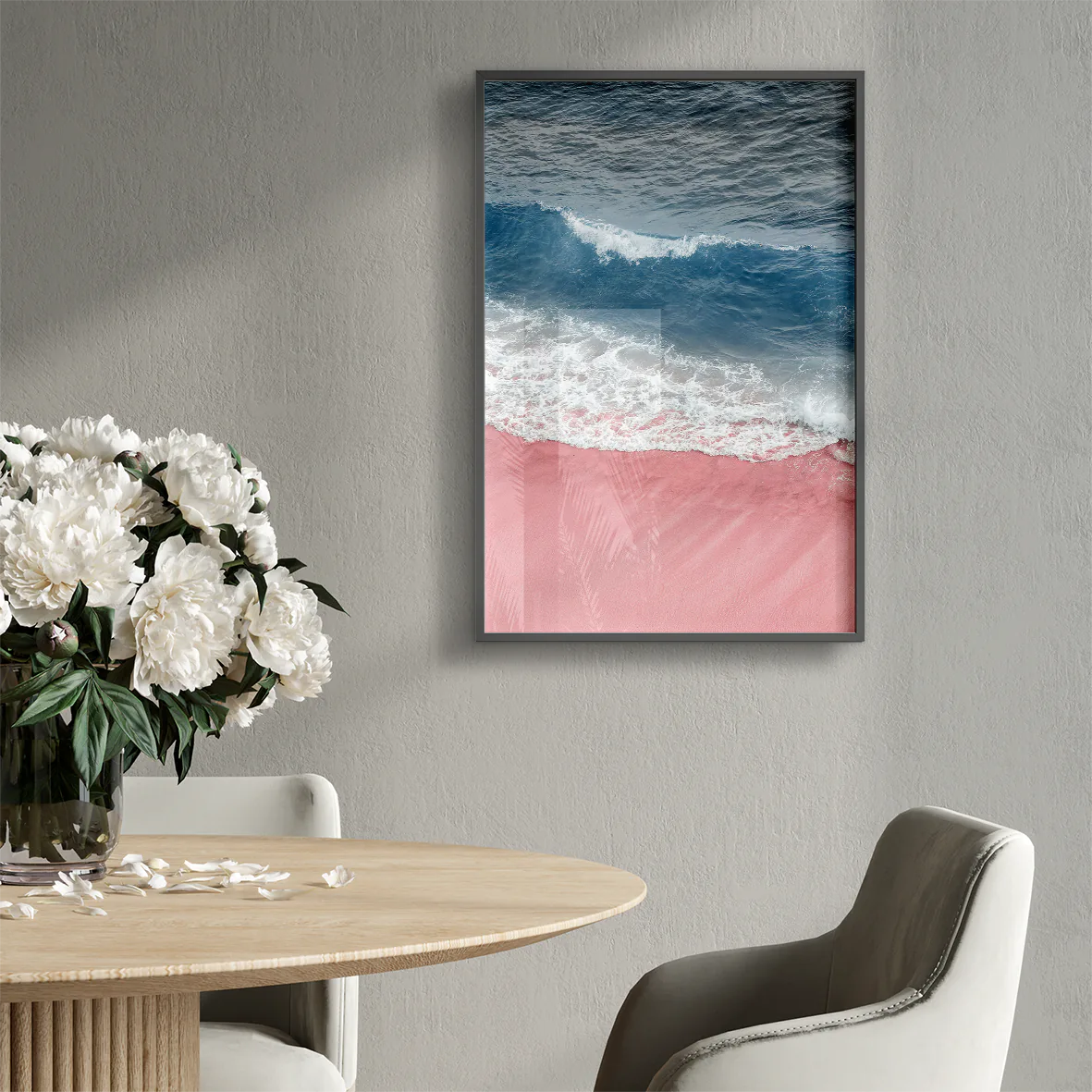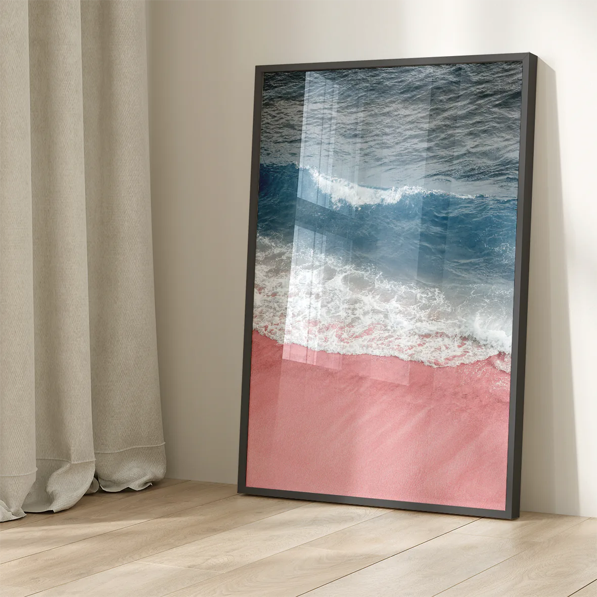 夢のような柔らかなピンクの砂浜と、穏やかに寄せる波を捉えたパステル調のビーチアートポスター。優しい色合いとミニマルな構図が、空間に北欧風の静寂と癒しをもたらします。リビング・寝室・書斎など様々なシーンで、日常に安らぎのひとときを演出。ストレス社会に疲れた心を優しく包む、タイムレスな海景色です。