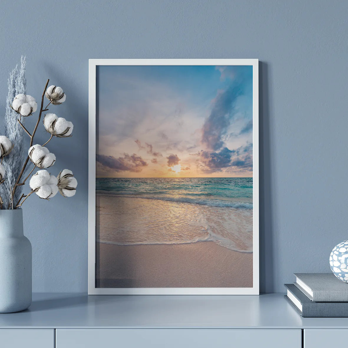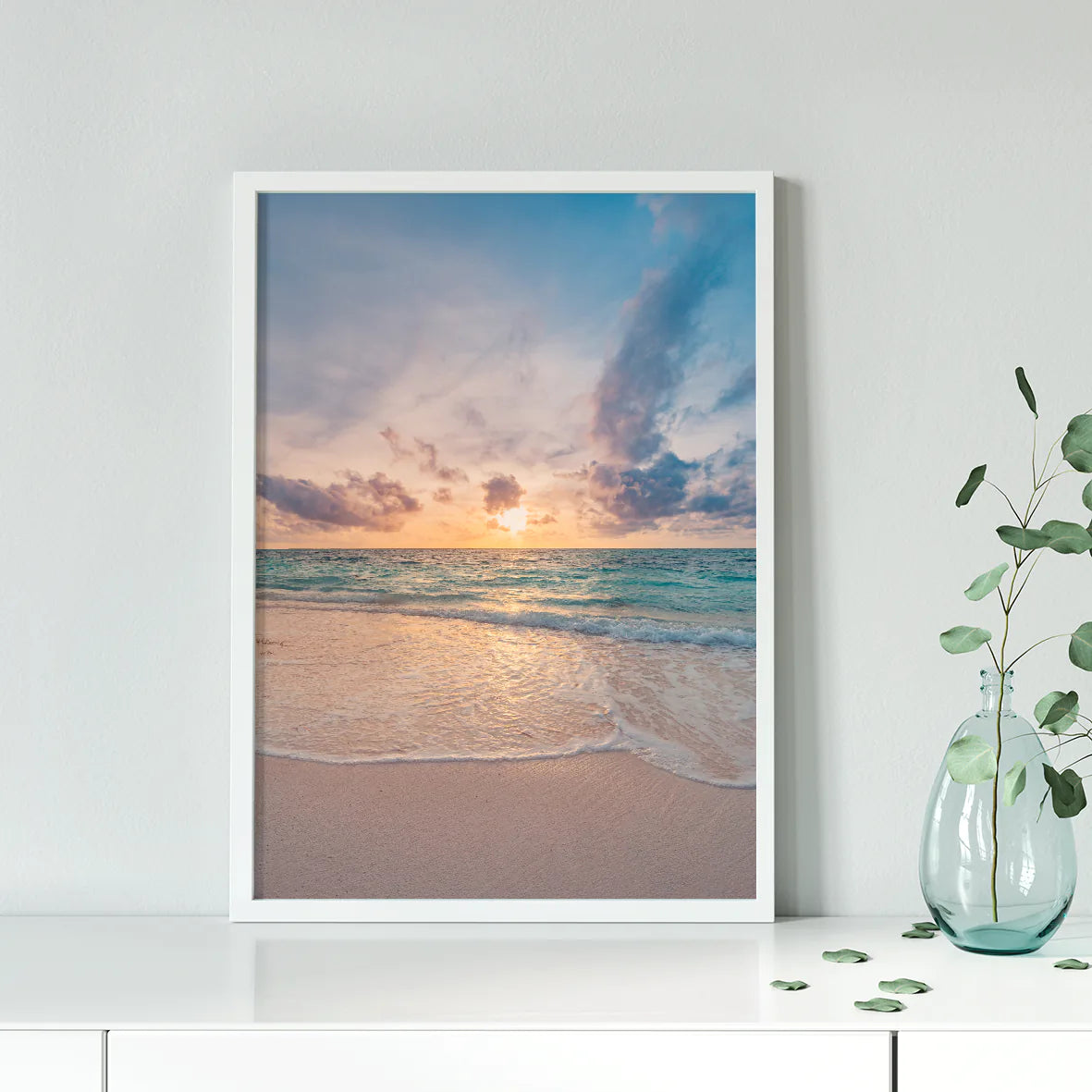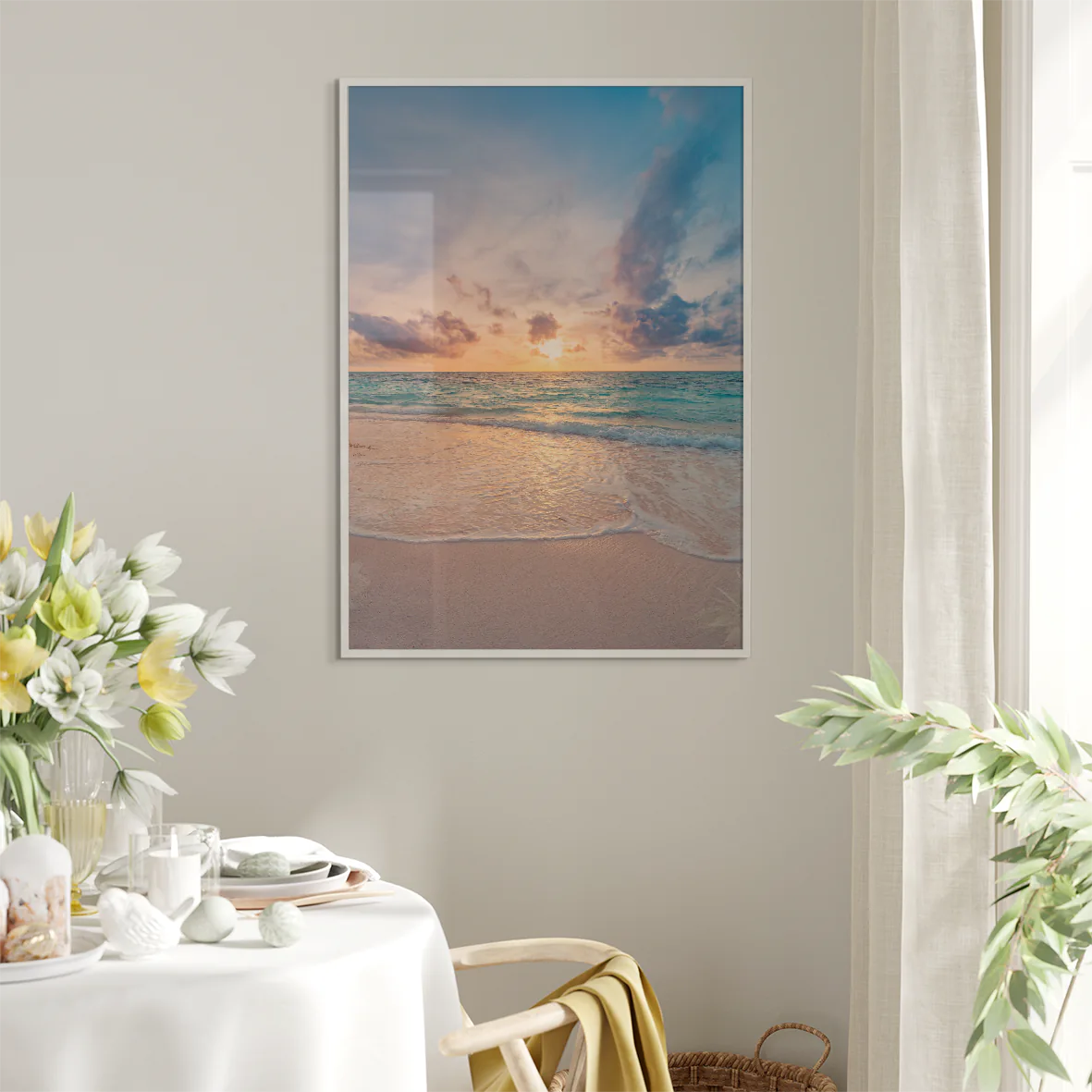 透明感のある青い海と柔らかな白い砂浜が織りなす、穏やかなトロピカルビーチの風景画。水平線の向こうに広がる無限の空間が、心に安らぎと開放感をもたらします。リビングや寝室、オフィスに飾れば、日常を忘れて南国リゾートにいるような気分を味わえる一枚。ストレス解消や癒し効果も期待でき、忙しい毎日のオアシスとなるアートです。