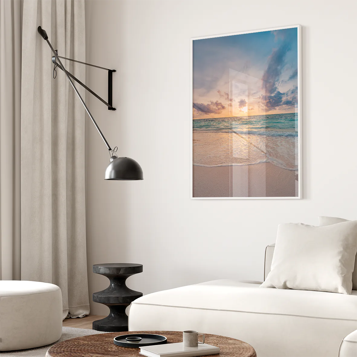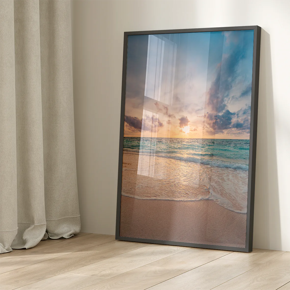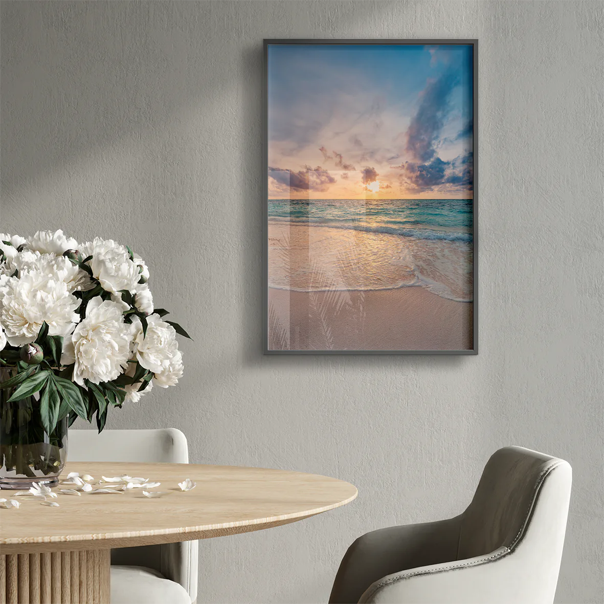 透明感のある青い海と柔らかな白い砂浜が織りなす、穏やかなトロピカルビーチの風景画。水平線の向こうに広がる無限の空間が、心に安らぎと開放感をもたらします。リビングや寝室、オフィスに飾れば、日常を忘れて南国リゾートにいるような気分を味わえる一枚。ストレス解消や癒し効果も期待でき、忙しい毎日のオアシスとなるアートです。