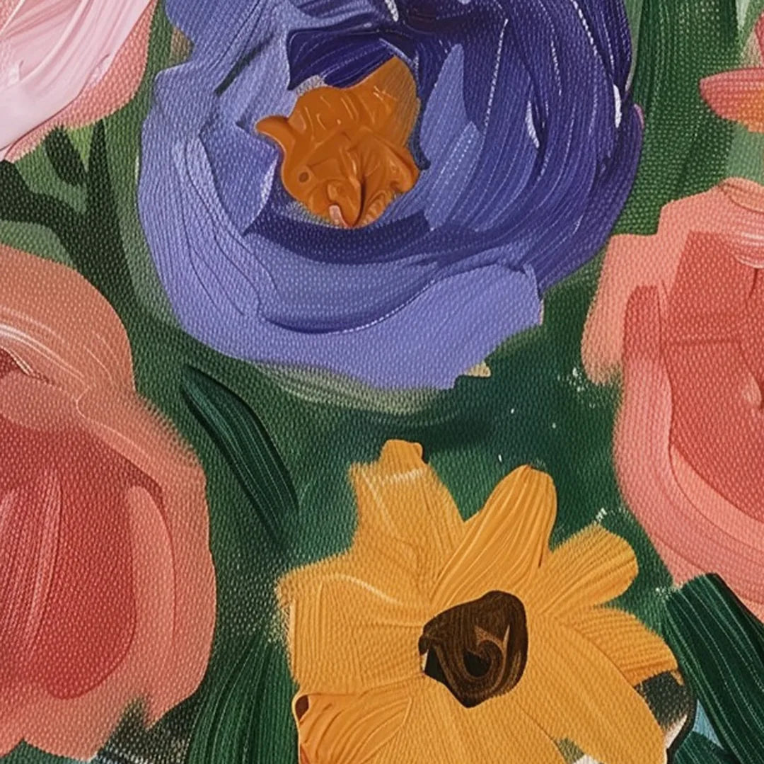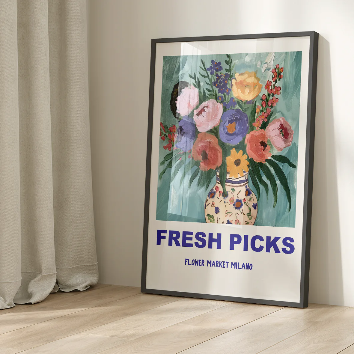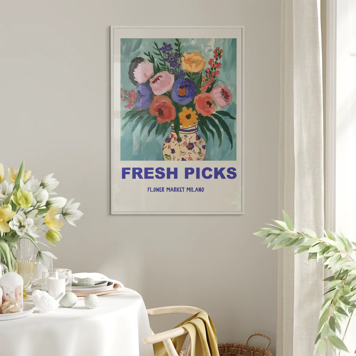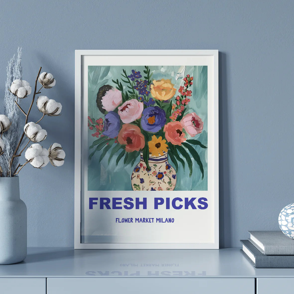 イタリア・ミラノの朝、市場に並ぶ摘みたての花々をキャンバスに閉じ込めた一枚。ローズやラナンキュラス、アネモネがカラフルに咲き誇り、クリーム色の背景と深いグリーンの葉が立体感を際立たせます。明るくポジティブな色彩が空間に生き生きとしたエネルギーを与え、リビングやダイニング、オフィスの雰囲気をぐっと華やかに。北欧テイストやシンプルモダンのインテリアとも相性抜群で、見るたびに市場の香りと季節の息吹を感じさせるアートポスターです。