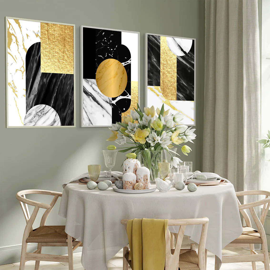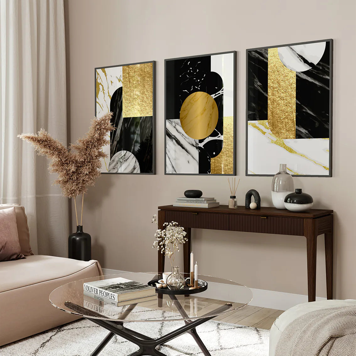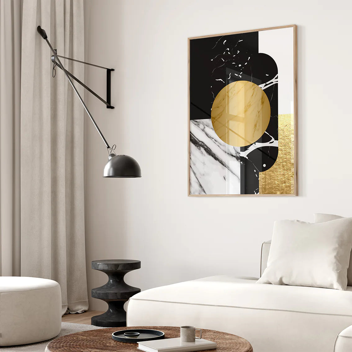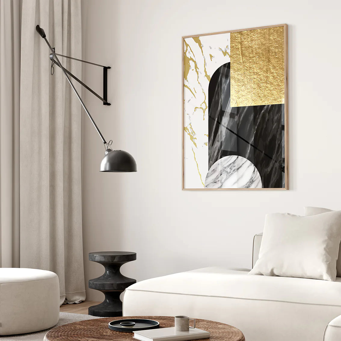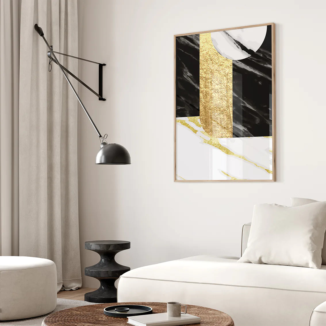 洗練されたゴールドの幾何学パターンと深い黒大理石のテクスチャーが織りなす、ラグジュアリーな抽象アートポスター。ミニマルでありながら存在感のあるデザインが、空間に北欧コンテンポラリーの上質な雰囲気をもたらします。リビング・書斎・オフィスなど様々なシーンで、アートギャラリーのような洗練されたアクセントとして活躍。新築祝いや開業祝いなどの特別なギフトにも最適です。高級モダンインテリアを好む方におすすめの、エレガントな3枚セットです。