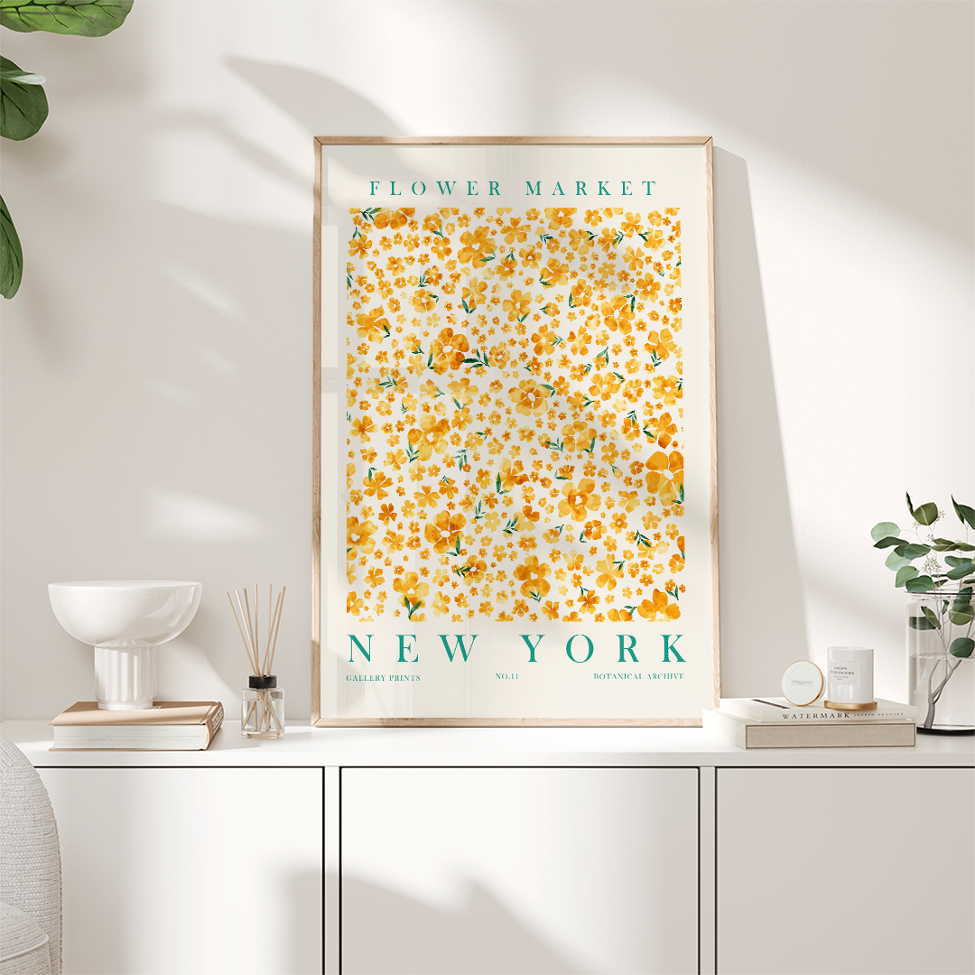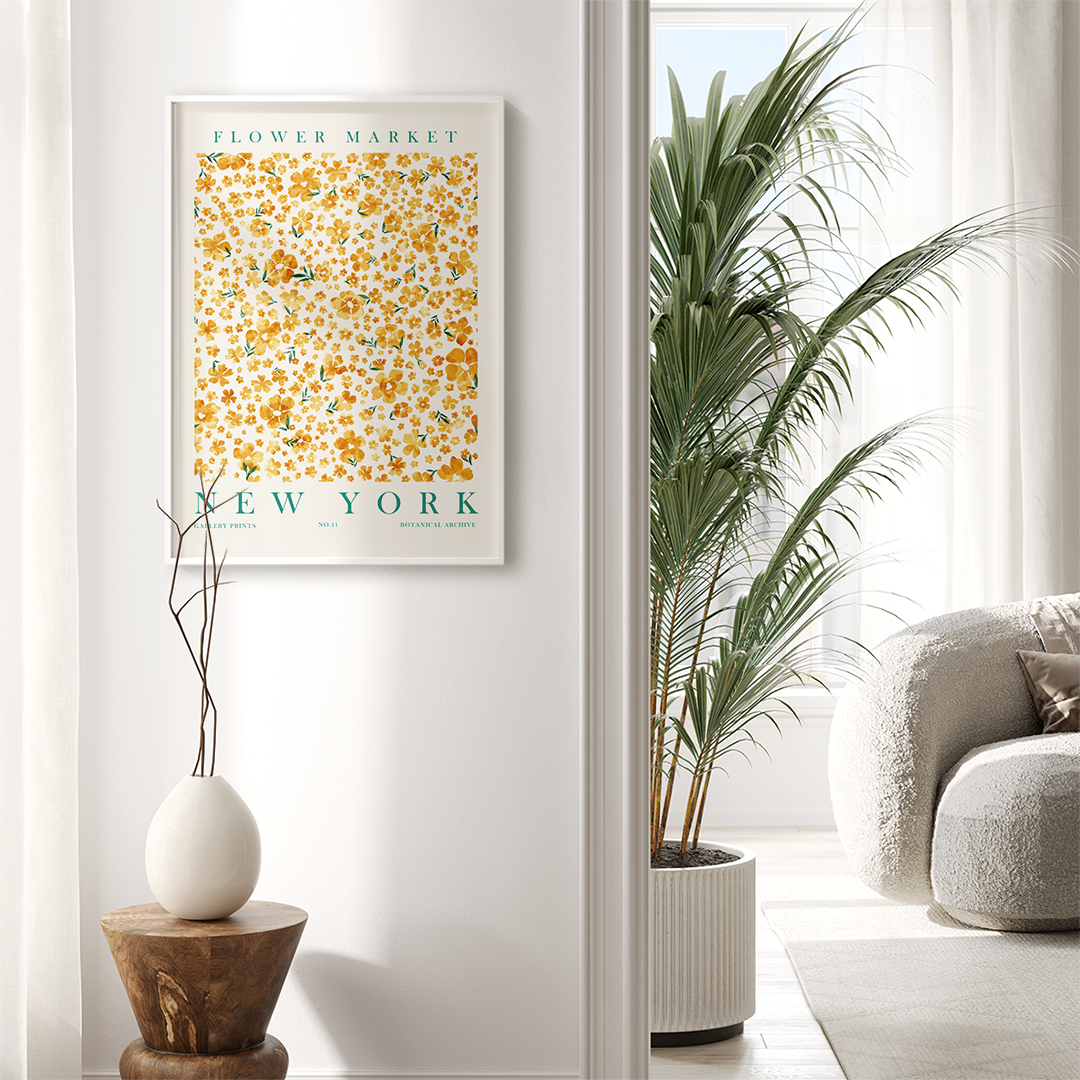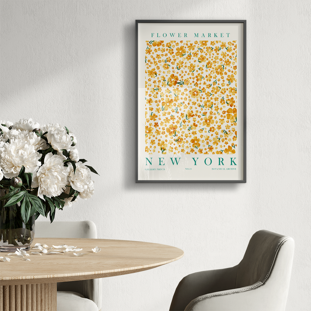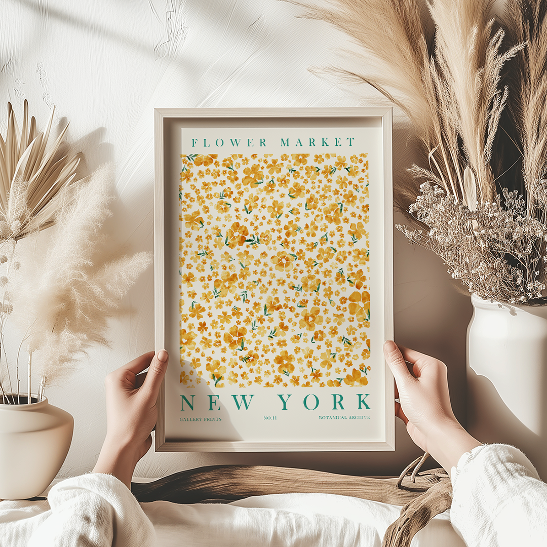 散りばめられたイエローの小花が、ニューヨークの賑わう花市場を思わせるポスター。瑞々しいグリーンの茎と上品なエメラルドのタイトル文字が絶妙なコントラストを生み、空間に快活さとヴィンテージ感をプラスします。リビングやダイニングはもちろん、キッチンやエントランスのアクセントにもおすすめ。北欧ミニマルからレトロポップまで幅広いインテリアに調和し、ギフトにも喜ばれるタイムレスなボタニカルアートです。