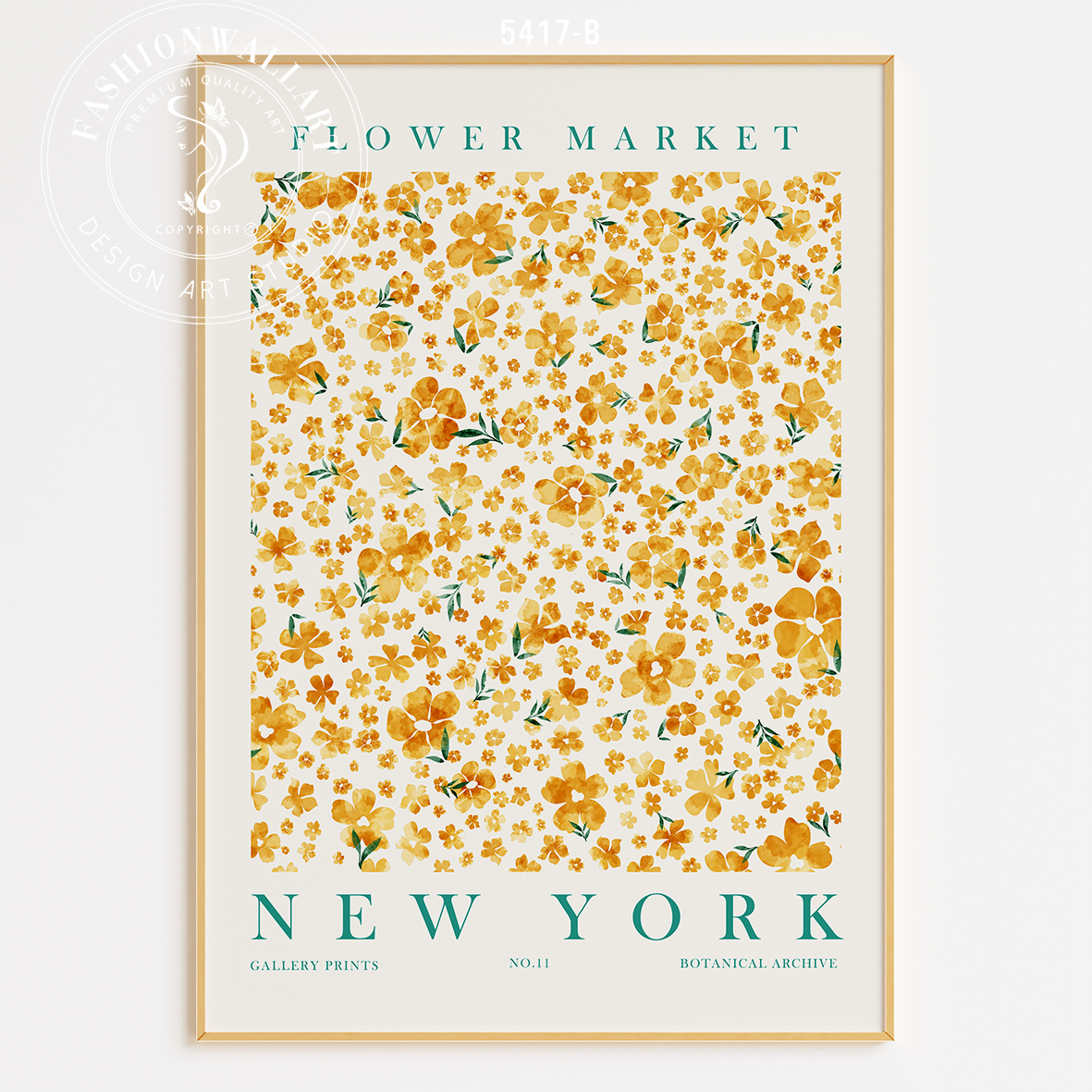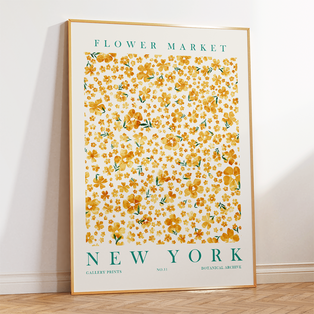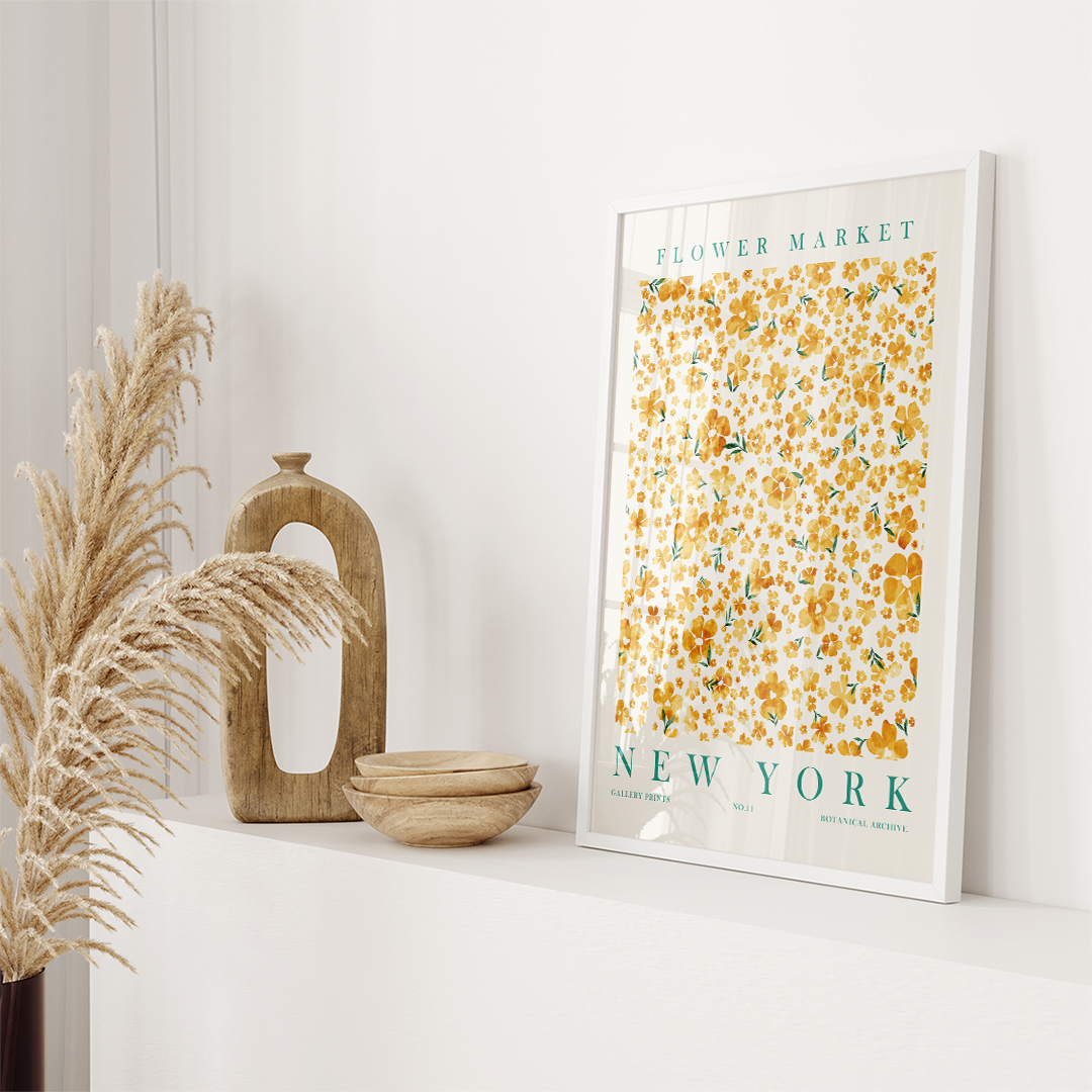 散りばめられたイエローの小花が、ニューヨークの賑わう花市場を思わせるポスター。瑞々しいグリーンの茎と上品なエメラルドのタイトル文字が絶妙なコントラストを生み、空間に快活さとヴィンテージ感をプラスします。リビングやダイニングはもちろん、キッチンやエントランスのアクセントにもおすすめ。北欧ミニマルからレトロポップまで幅広いインテリアに調和し、ギフトにも喜ばれるタイムレスなボタニカルアートです。