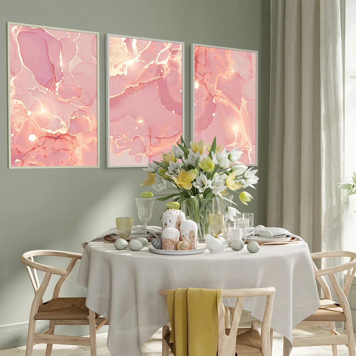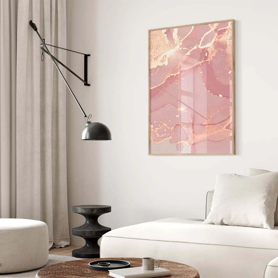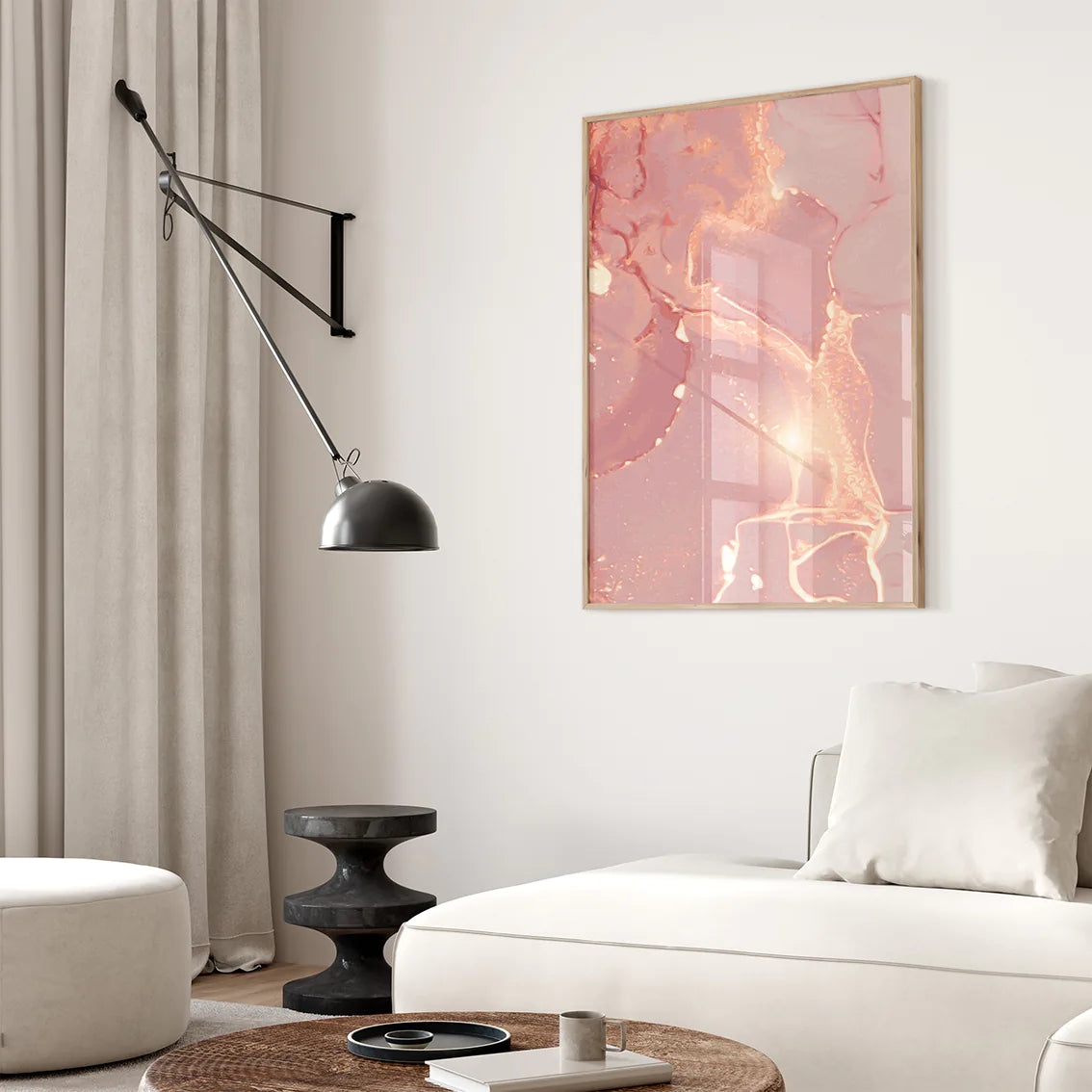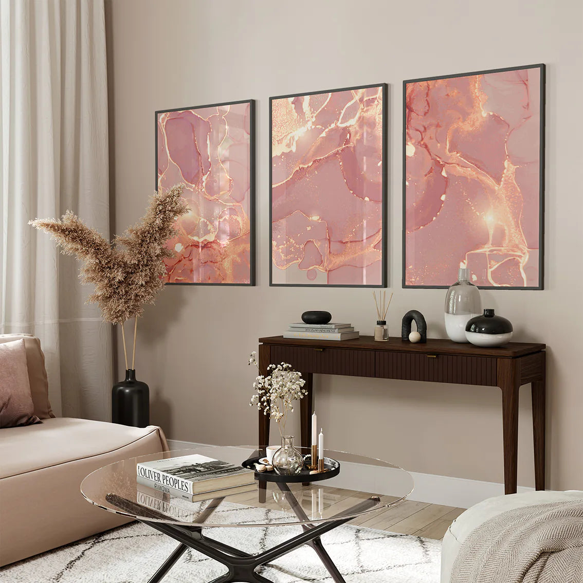 優雅なブラッシュピンクと温かなローズゴールドが調和した、抽象的で洗練されたアートポスター。柔らかなグラデーションと繊細な色使いが、お部屋に上品で女性らしい雰囲気をもたらします。北欧フェミニンスタイルの代表的な作品として、寝室やパウダールーム、リビングなど、特別な空間づくりに最適。結婚祝いや新築祝いなどの贈り物としても喜ばれる、エレガントな3枚セットです。