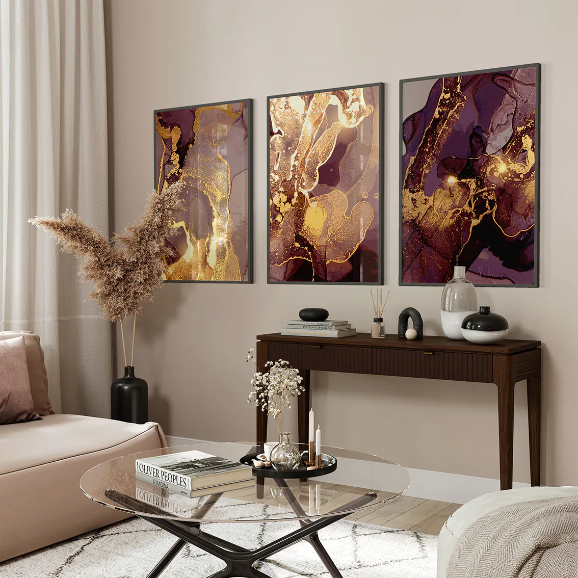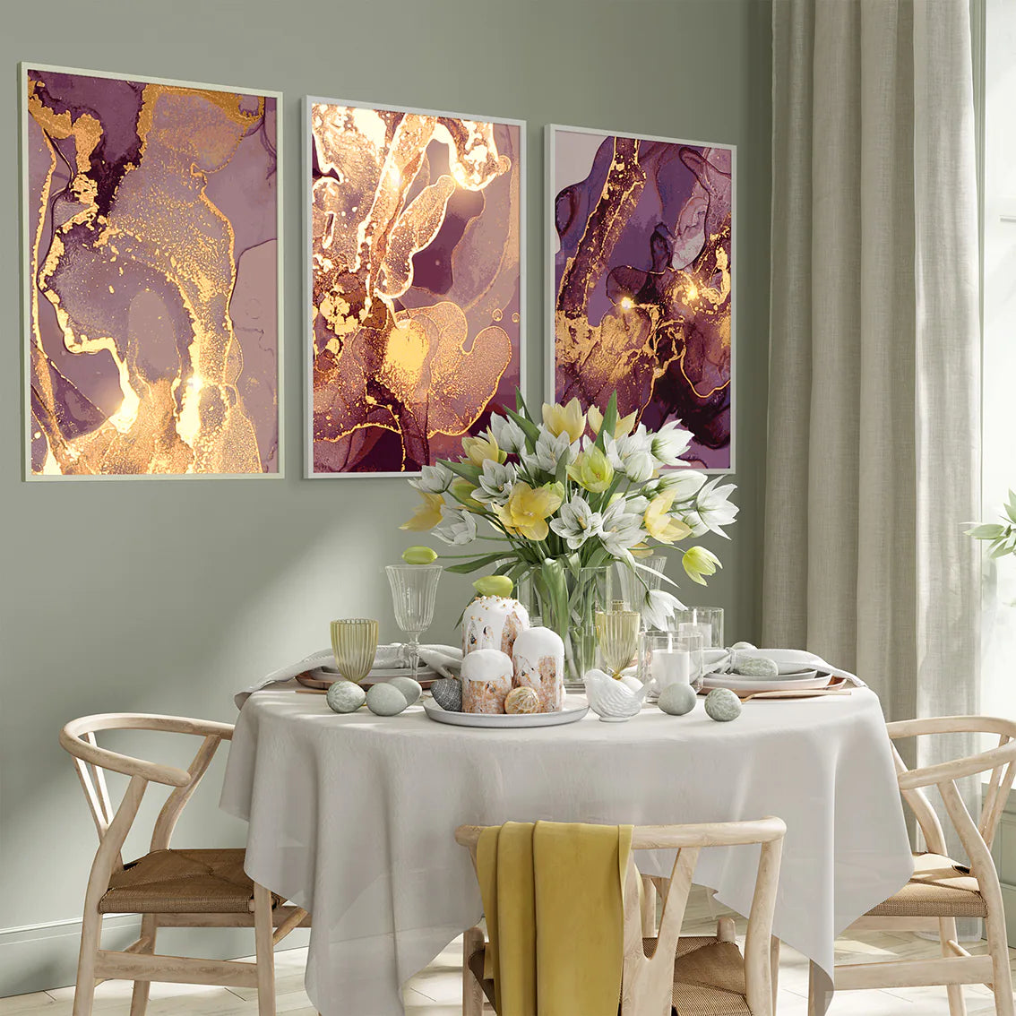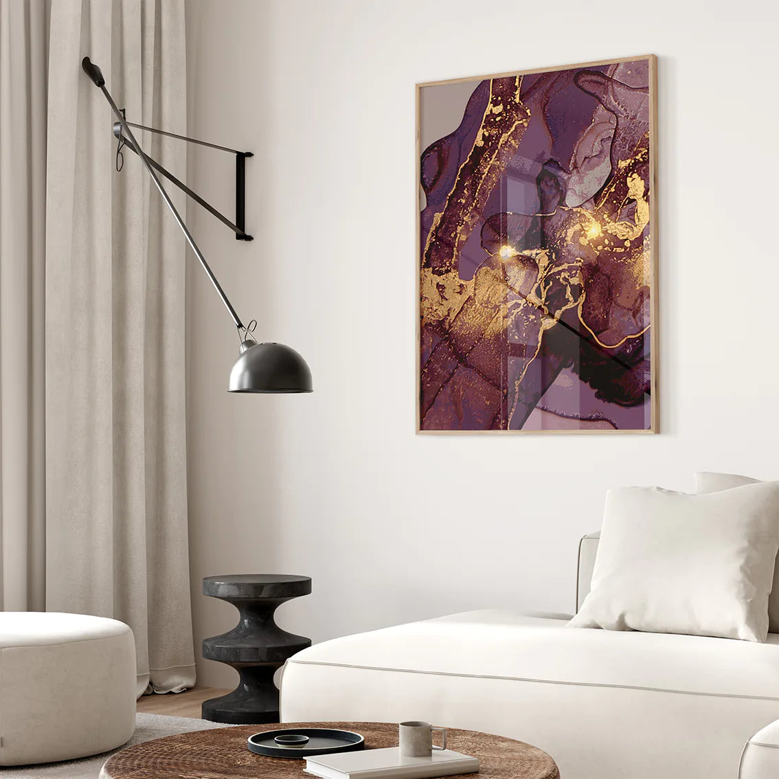流れるようなゴールドとディープパープルが織りなす、神秘的な渦模様の抽象アートポスター。繊細なグラデーションと華やかな色彩が、空間にラグジュアリーな北欧モダンの雰囲気をもたらします。リビング・寝室・書斎など様々なシーンで、アートギャラリーのような洗練されたアクセントとして活躍。新築祝いや引越し祝いなどの特別なギフトにも最適です。高級感インテリアを好む方におすすめの、タイムレスな3枚セットです。