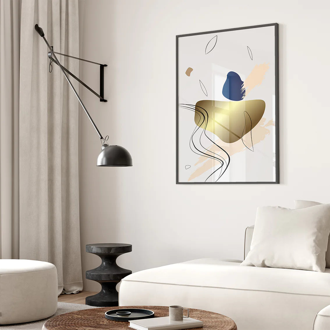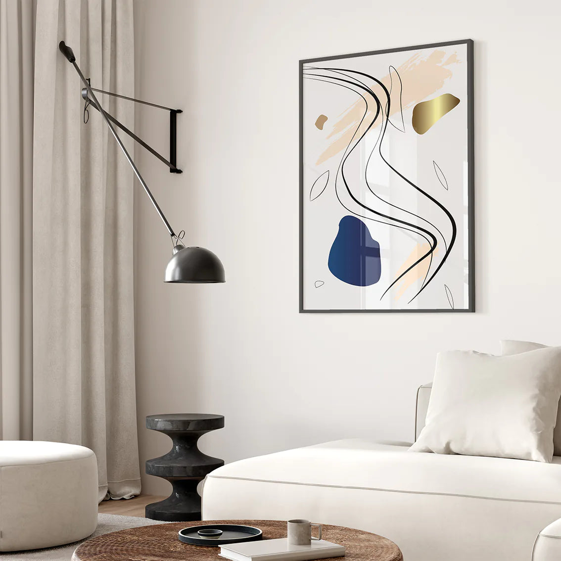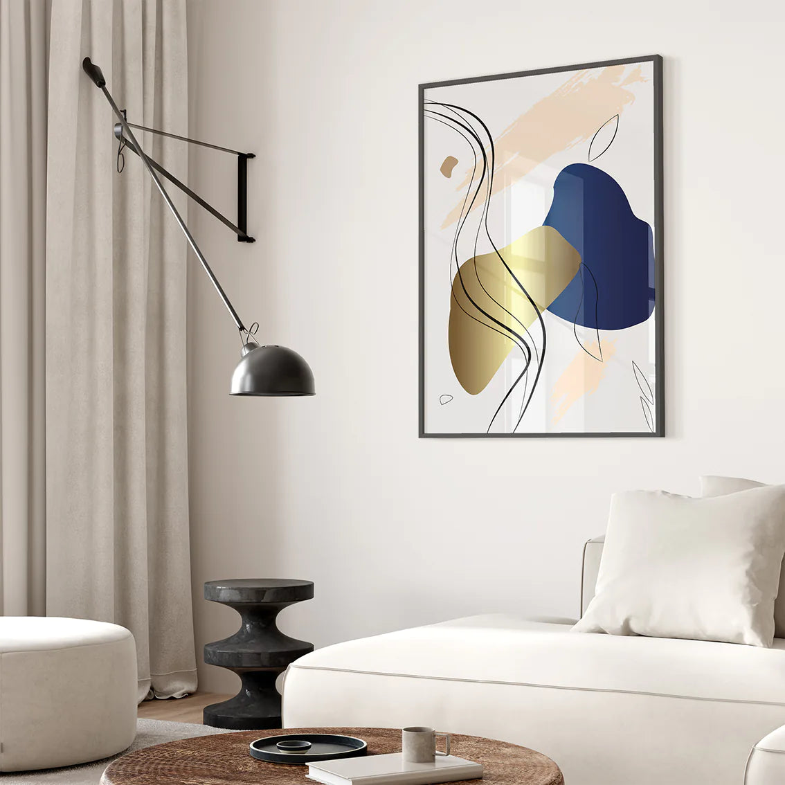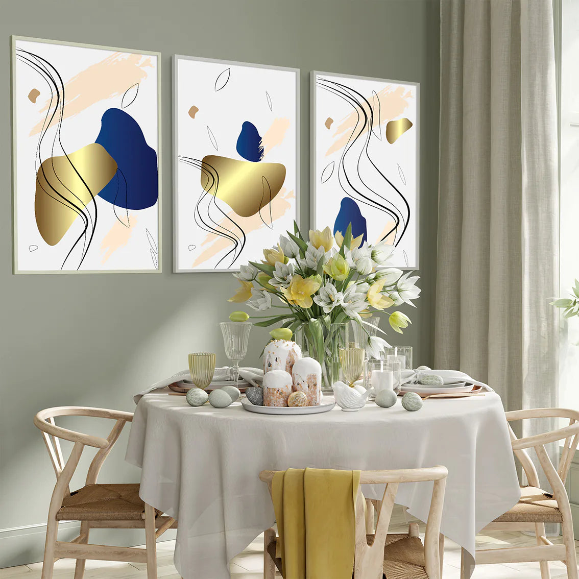 やわらかなベージュ背景に浮かぶ、ブルーとゴールドの有機的なシェイプが印象的な抽象アートポスター。流れるような曲線と温かみのある色調が、空間に洗練された北欧モダンの雰囲気をもたらします。リビング・寝室・書斎など様々なシーンで上質なアクセントとして活躍。新築祝いや引越し祝いなどのギフトにも最適です。シンプルインテリアを好む方におすすめの、タイムレスな3枚セットです。