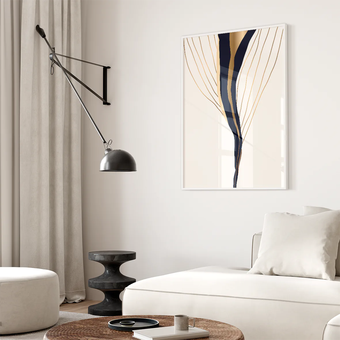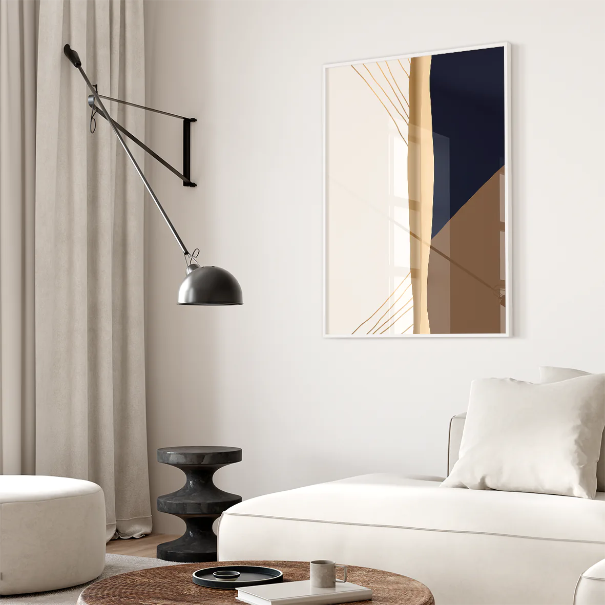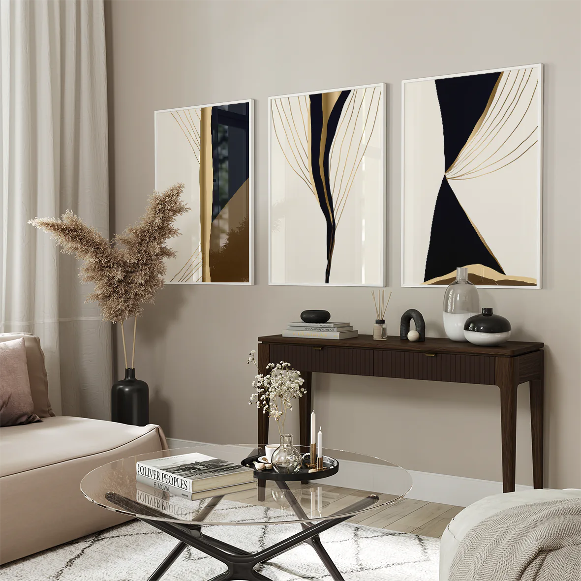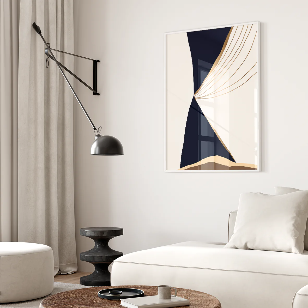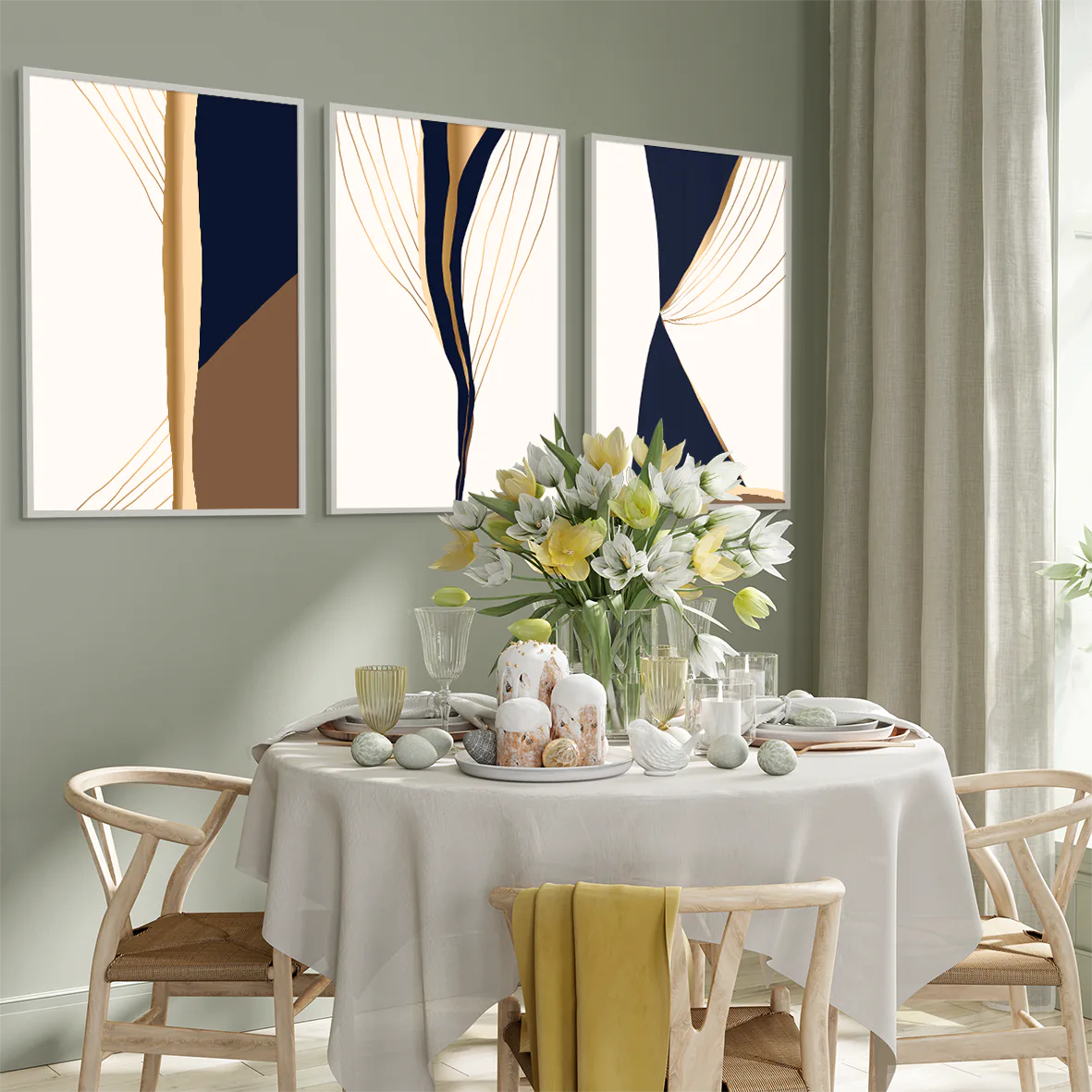 深いネイビーブルーとゴールド、クリームベージュが織りなす洗練された抽象アートポスター。流れるようなフォルムと上品なカラーバランスが、空間にラグジュアリーな北欧コンテンポラリーの雰囲気をもたらします。リビング・書斎・寝室など様々なシーンで、アートギャラリーのような高級感あふれるアクセントとして活躍。新築祝いや引越し祝いなどの特別なギフトにも最適です。高級モダンインテリアを好む方におすすめの、エレガントな3枚セットです。