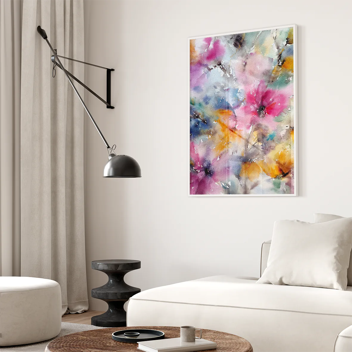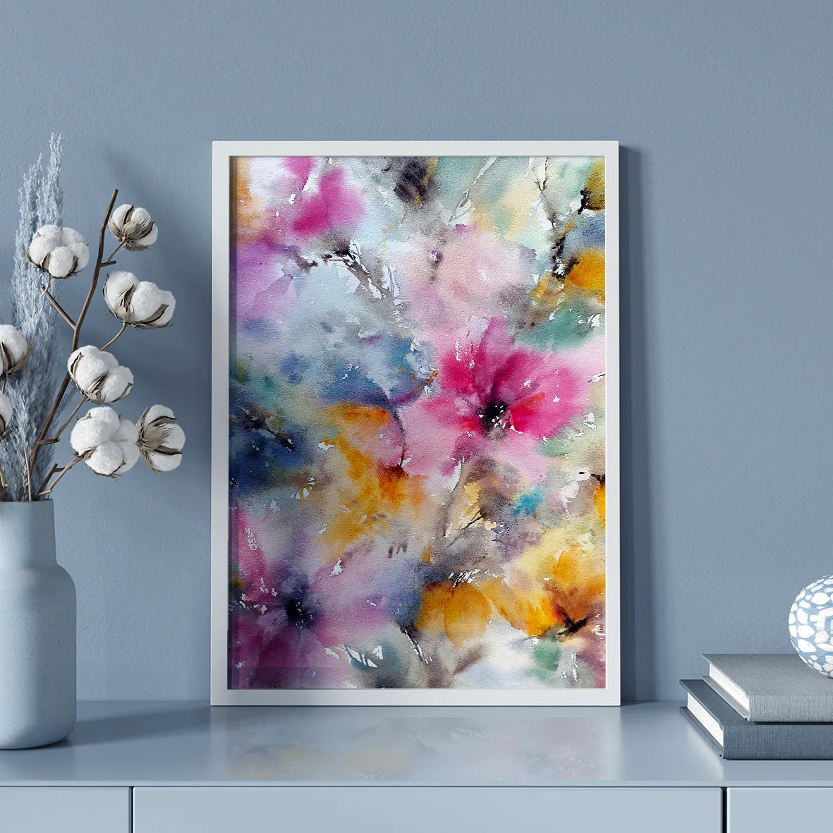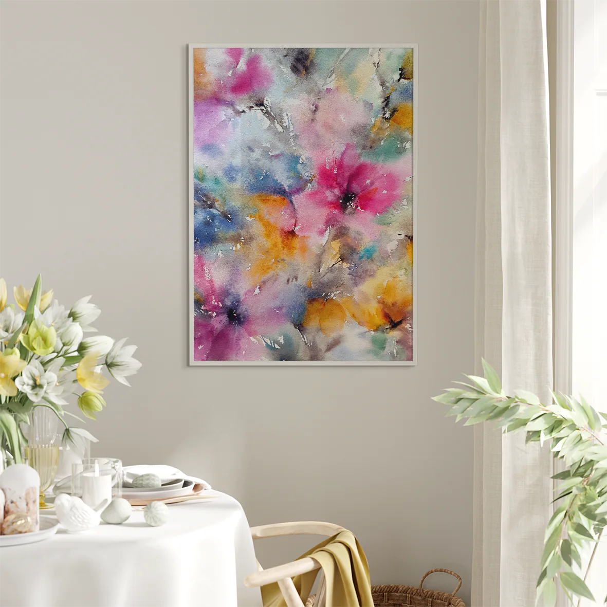 ふんわりと重なる水彩レイヤーで描かれた花々が、春風のような軽やかさと彩りを運ぶ一枚。ピンク・イエロー・ターコイズのパステルトーンが白壁に映え、空間に優しい光を添えます。リビングや寝室、玄関に飾れば、日常を明るく照らす花束の存在感。北欧テイストやシンプルモダンのインテリアとも好相性で、見るたびに心が華やぐアートポスターです。