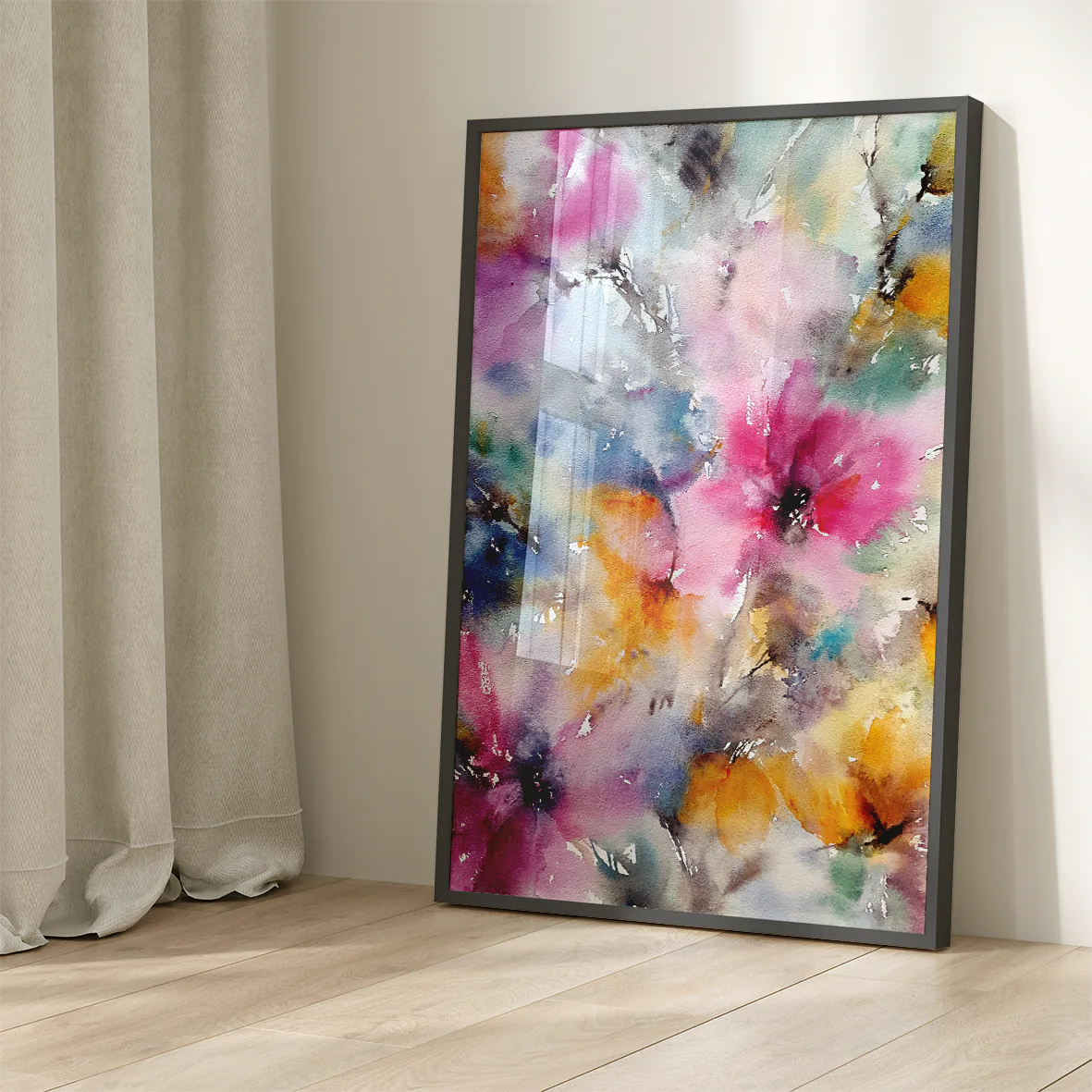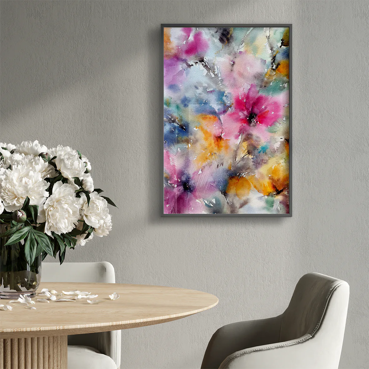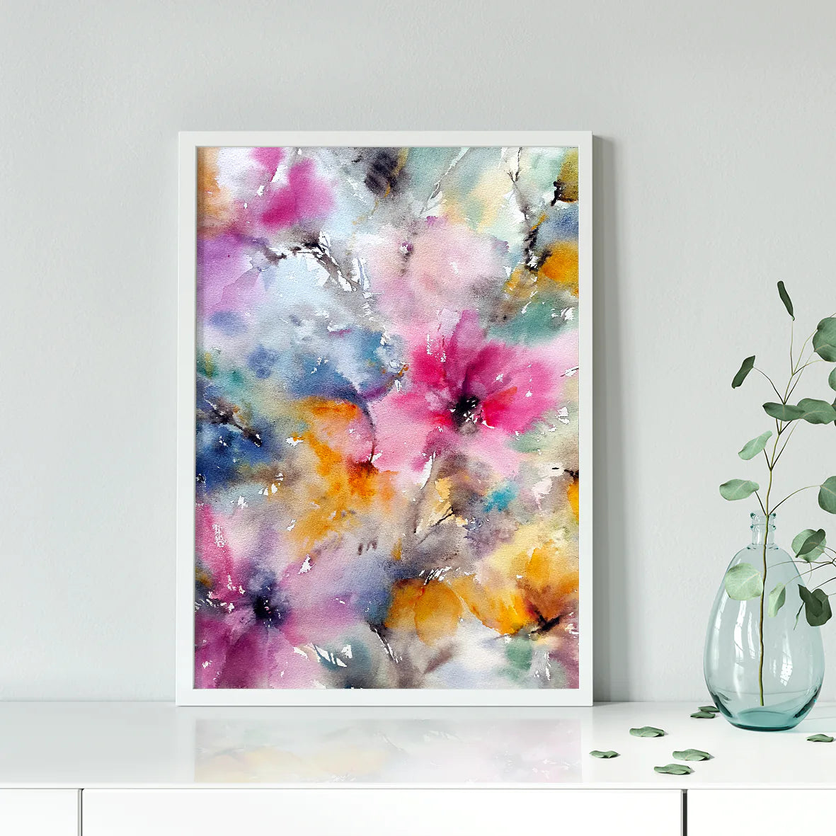 ふんわりと重なる水彩レイヤーで描かれた花々が、春風のような軽やかさと彩りを運ぶ一枚。ピンク・イエロー・ターコイズのパステルトーンが白壁に映え、空間に優しい光を添えます。リビングや寝室、玄関に飾れば、日常を明るく照らす花束の存在感。北欧テイストやシンプルモダンのインテリアとも好相性で、見るたびに心が華やぐアートポスターです。