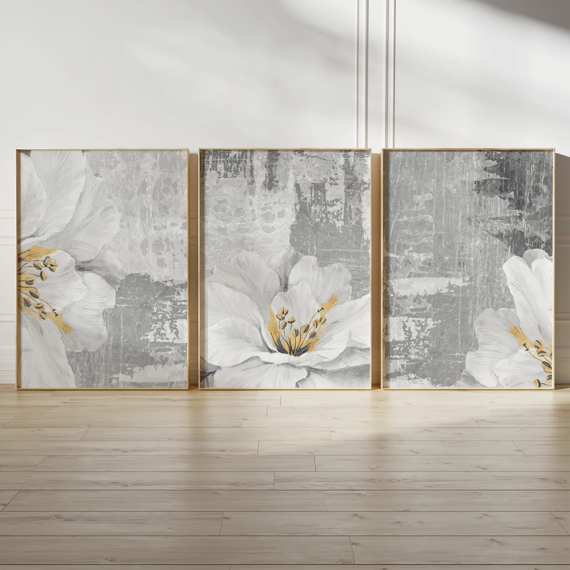 くすみグレーのコンクリート風テクスチャに、柔らかな白百合の花弁と繊細なゴールドアクセントを重ねた抽象アートポスター。落ち着いたニュートラルトーンが空間に静けさをもたらし、花芯のゴールドがさりげなく華やぎを添えます。北欧風やモダンインテリア、ミニマリズムとも相性抜群で、リビング・寝室・玄関など多彩なシーンで上質なアクセントとして活躍。新築祝いや結婚祝いなどのギフトにも最適な3枚セットです。